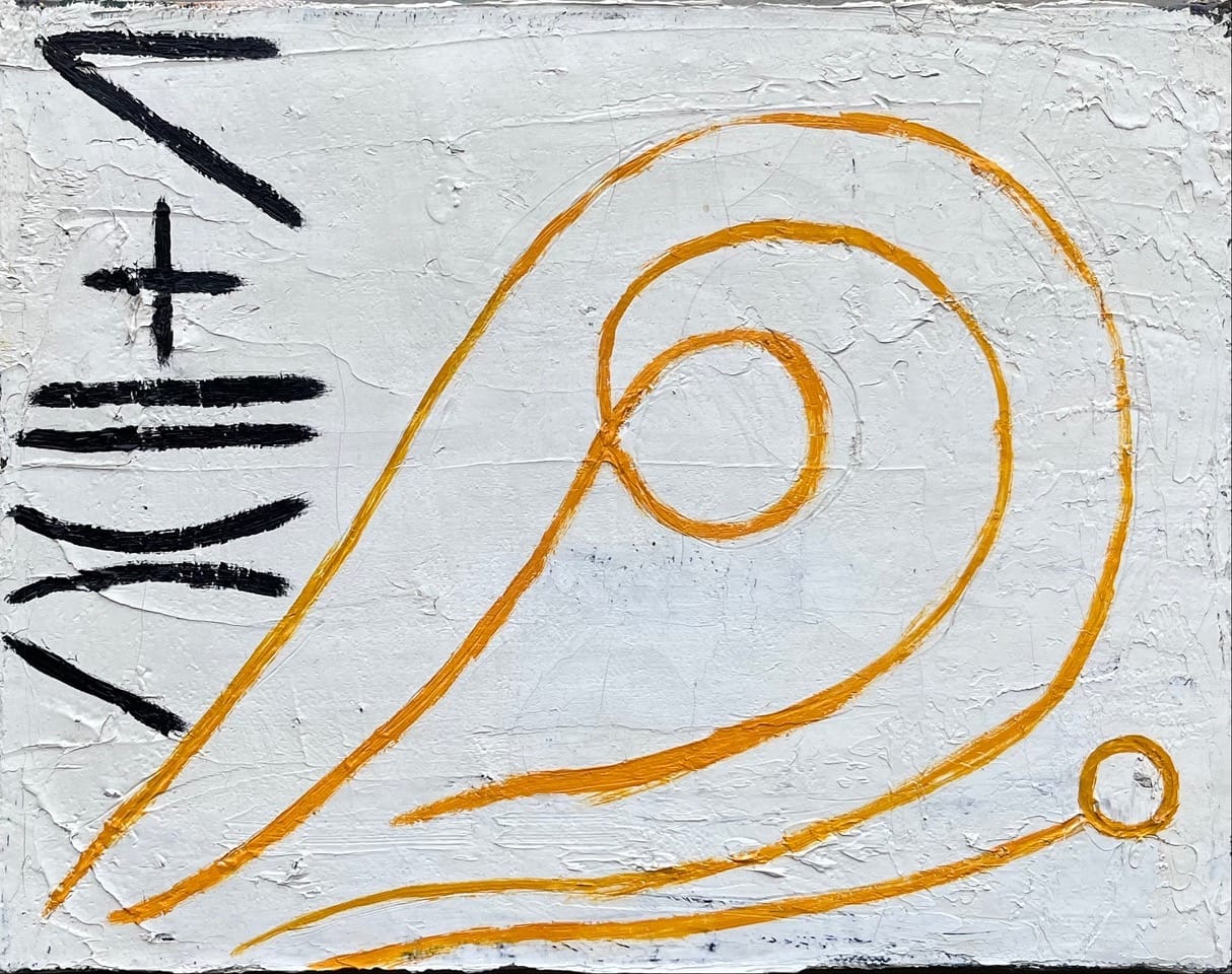 When Peter Acheson makes art honoring A. R. Penck, Myron Stout, Joan Miró, Gandy Brodie, and others, he channels signature features of their work but transforms them into something all his own. When he draws in paint, the lines are often delicate arabesques that sit somewhere between ideogram and ornament. When he attaches different found objects, such as feathers and bones, to the surface of his work, viewers can sense his belief in art as both talisman and record keeper. When the surfaces are thick and crusty, he expresses his love for materiality, but does not fetishize it. Moving from image to abstract emblem to asemic writing to legible inscription, while working on canvas, panel, tarp, and canvas board, it is clear that Acheson is not precious about what he makes. All of these different, contradictory aspects make him difficult to characterize, and that resistance is one reason why I first wrote about him in 2005.