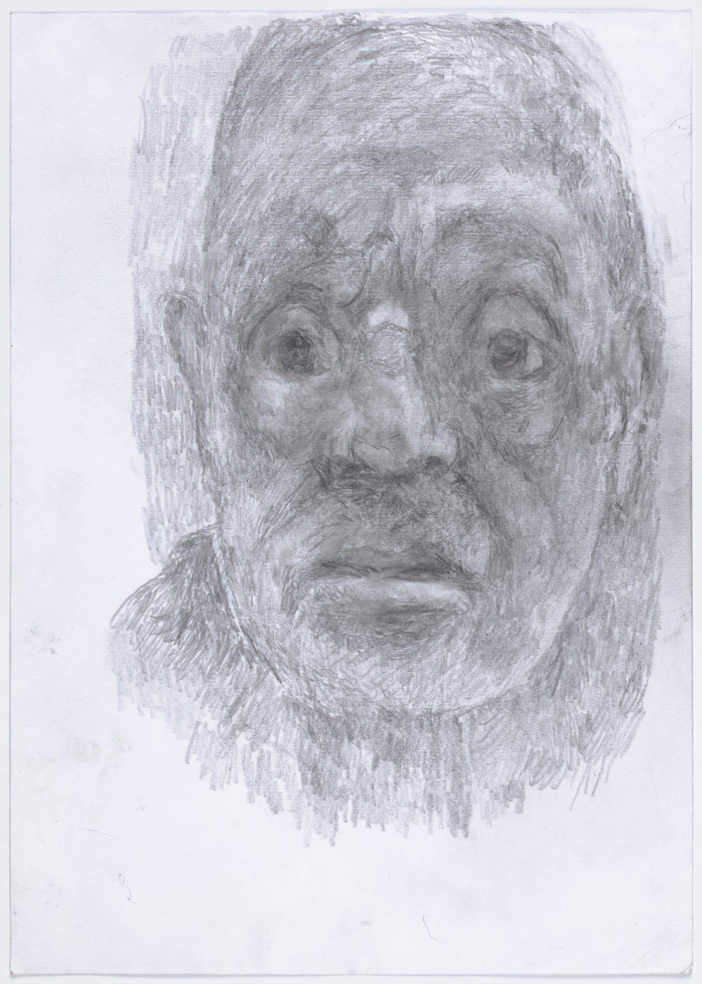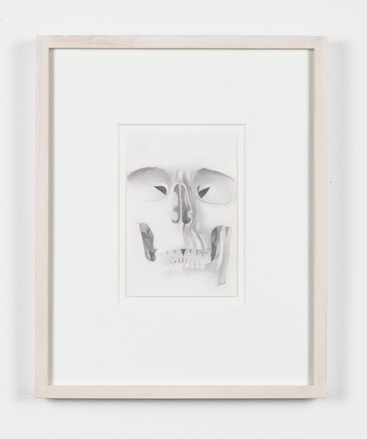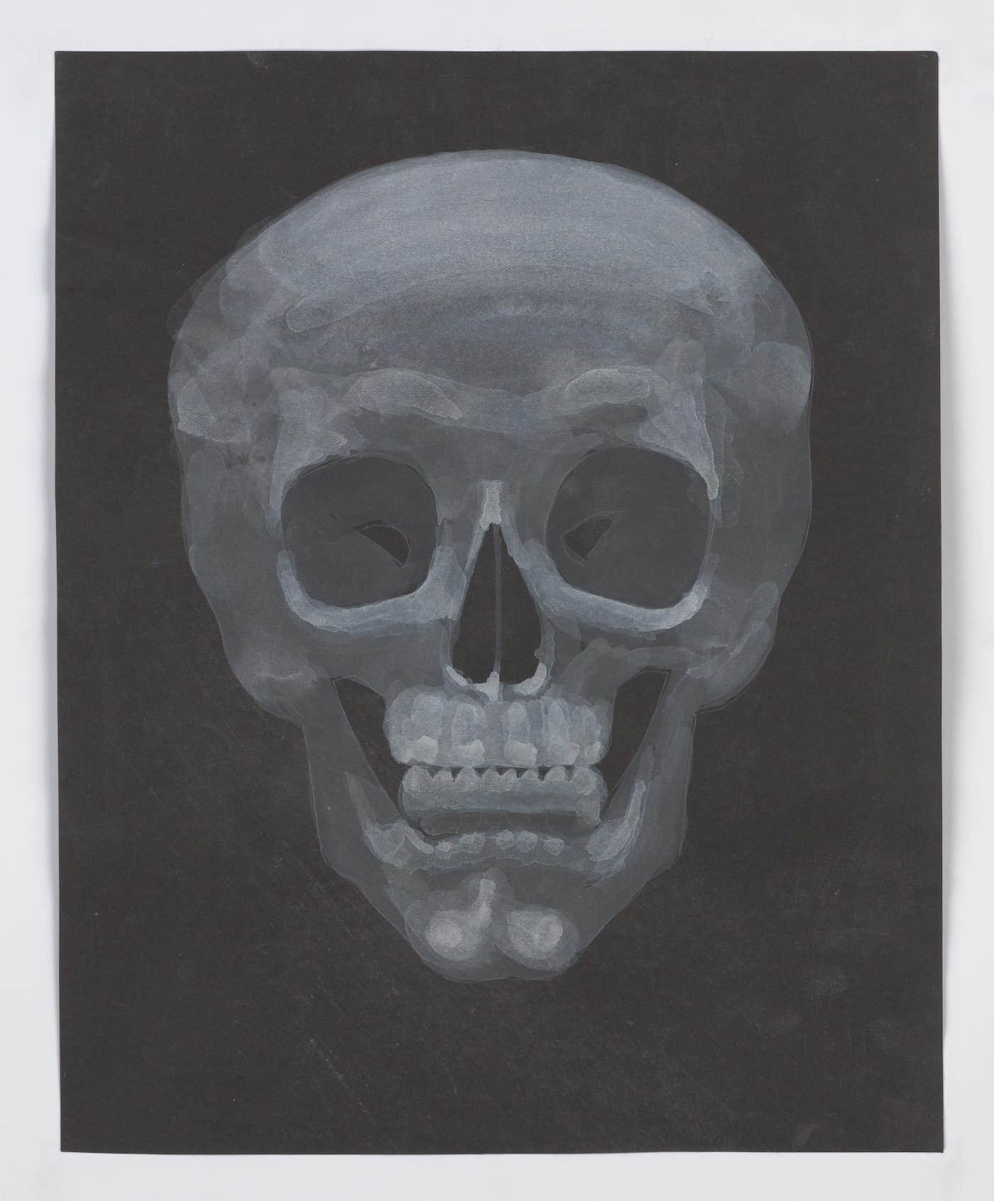 Another group, done in white gouache on black paper, is like looking at an X-ray. The application and density of the gouache, synonymous with the thickness of the bone, underscores the material existence of the works; they are things to be looked at, contemplated, reflected upon. They are modern vanitas. What Dreher has done is strip away all the drama surrounding this subject until all that is left is a skull looking back at us, as if in a mirror.