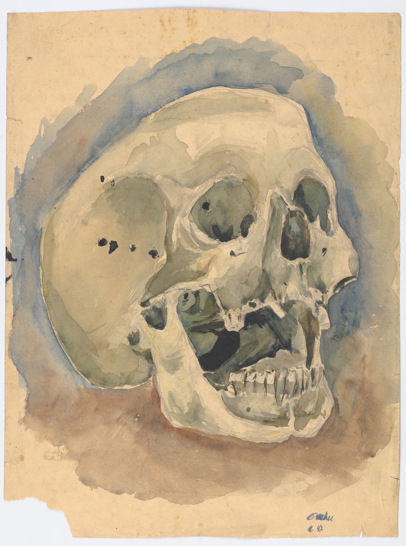 The size of the skull within the different sheets of paper underscores the artist’s intimacy with the subject: he is not looking at an object lying on a table. Even as a teenager, he closed the distance between himself and the thing he was looking at. In an untitled work from 1947, done in watercolor, ink, and pencil, Dreher scrutinizes an open-mouthed skull, which he renders as barely contained by the paper’s edges. One sees in the tension between subject and container an inkling of what is to come when, in 1974, he turns his attention to the empty glass.