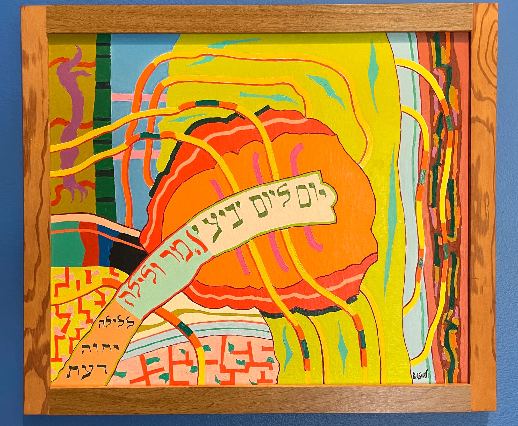 If anything, Judaism is proudly visible in many of his compositions. “K.-4-1976” (1976) unfurls the Hebrew letters of Psalm 19, which translates to, “Day after day they pour forth speech; night after night they reveal knowledge.” The letters drip over a bulbous orange, coral, and magenta background — a brain soaking up wisdom. Yellow and lime lines scrawl behind the letters, over the brain, and crash into the edge of the framed canvas. They’re synapses seeking information from beyond the realm of the painting.