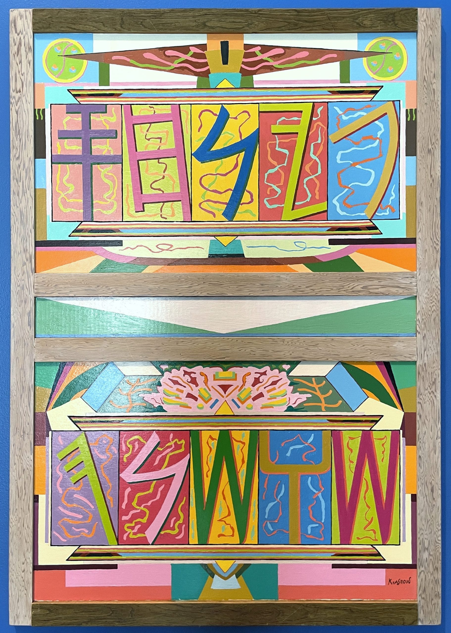 Hebrew characters are also the prominent focal point in “K.-14-1975 / K.-15-1975” (1975), a vertical painting that uses its wood frame to strictly divide the canvas into two sections. Abstracted letters, which pop off bright, squiggly lines, coyly spell out Krasnow and his wife, Rose’s, Hebrew names: Pincahs and Shoshana. The characters, not quite depicted in their traditional block form nor the handwritten Hebrew script, double as a love note in plain sight, a secret message that only the two could understand.