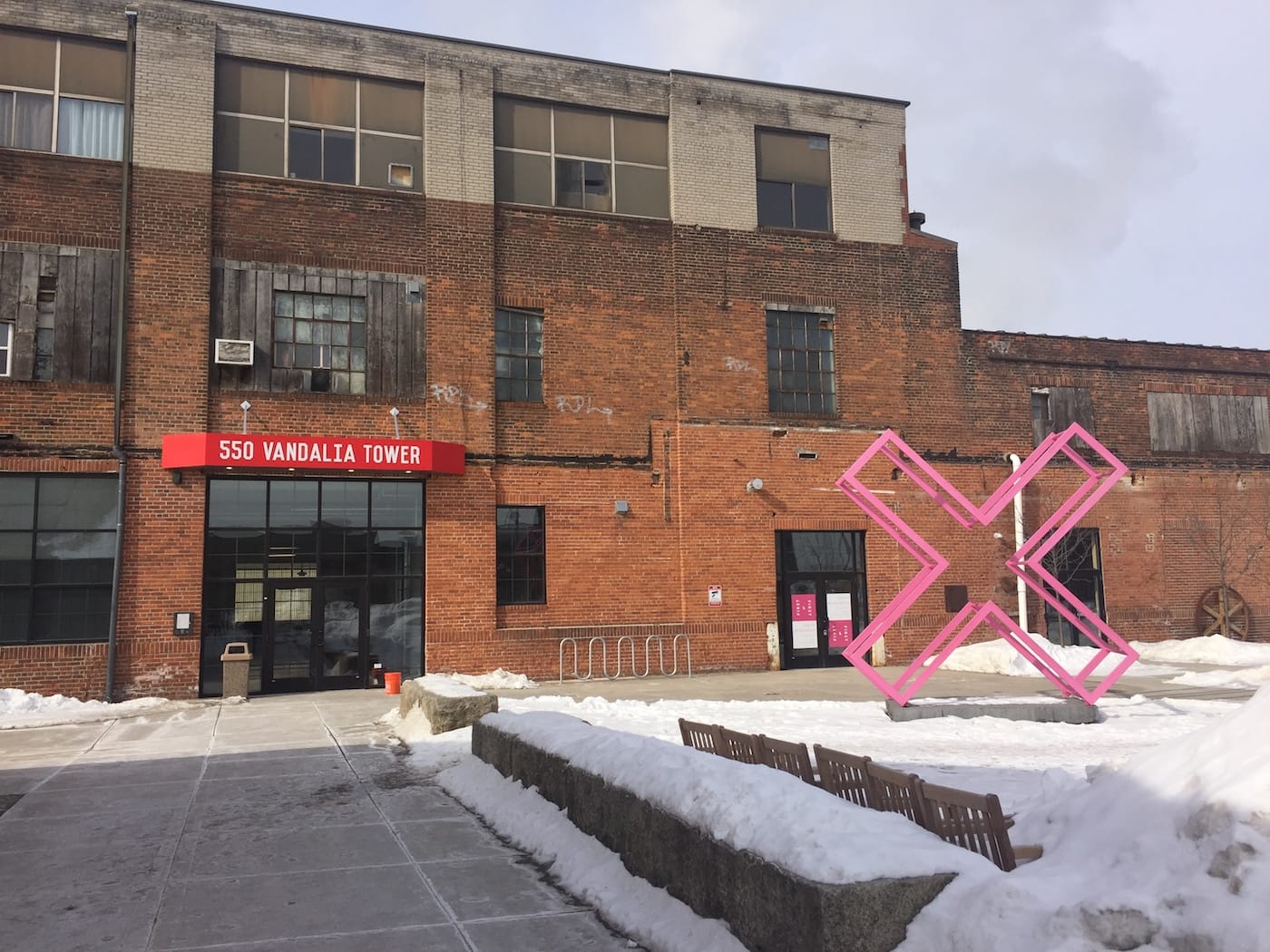 Lynn Barnhouse, an interior designer and another former tenant of Vandalia Tower, believes that Remes has left the space worse off. “He has such a reputation for being creative,” she said of Remes. “The work doesn’t live up to the reputation.” According to Barnhouse, the Vandalia Tower campus used to have an interesting space between the two main buildings, where railroad tracks once ran. “It had a magical sunken courtyard kind of feeling,” she said. “Now it’s just a paved sidewalk and he stuck some signs up there.”