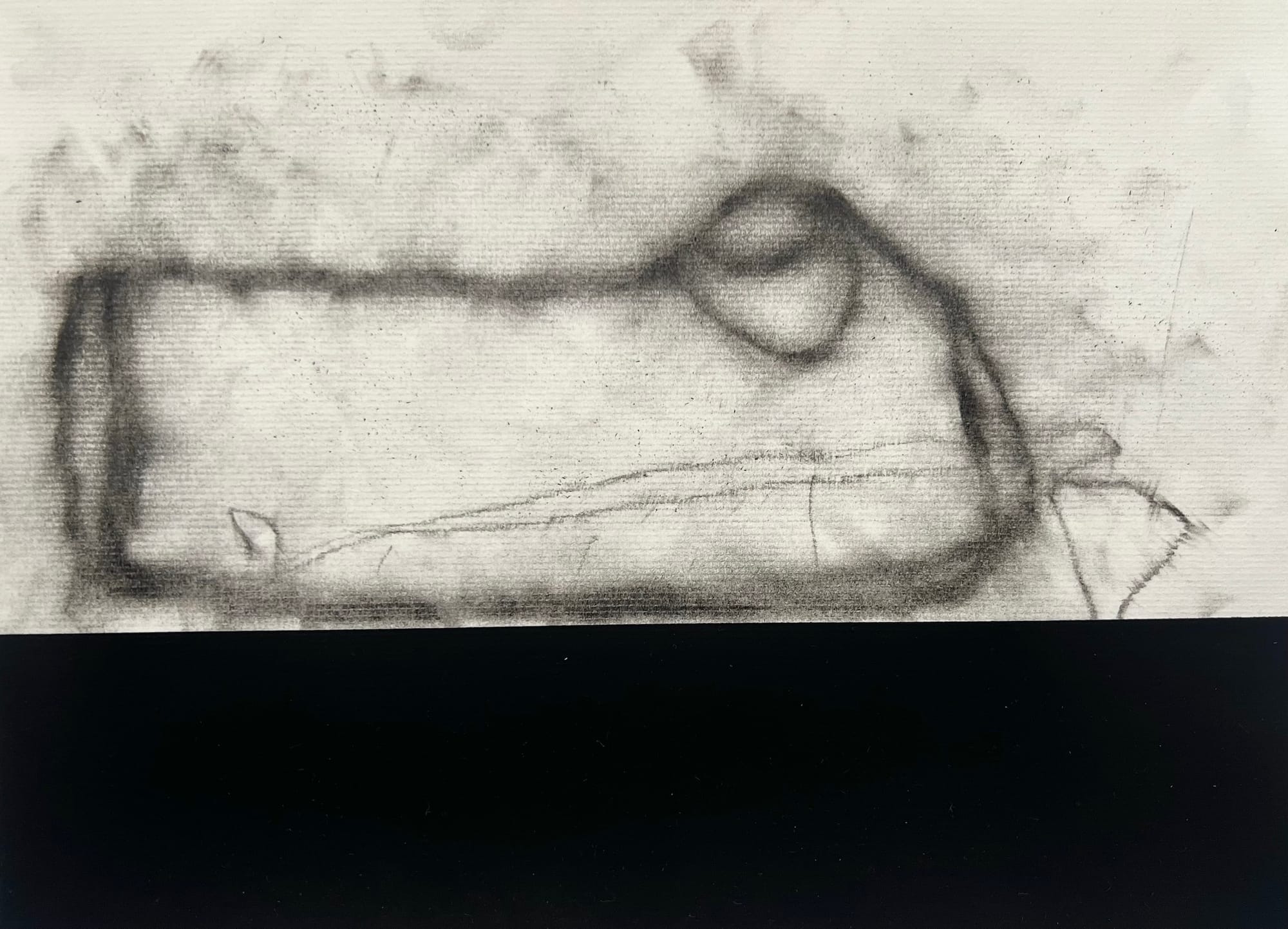 The third group of works, collectively titled Albers Drawings, is comprised of charcoal drawings depicting mushrooms, leaves, and other flora and fauna Sharp witnessed on his walks around the foundation’s property. Each drawing shows a single object from memory, a record of observations. One exception is group of abstract works, for which the artist covered a sheet of paper with a layer of charcoal before bringing it out into the rain; the drops dissolved the charcoal, leaving a series of uneven spots. I could guess the source of some images, while others eluded me.