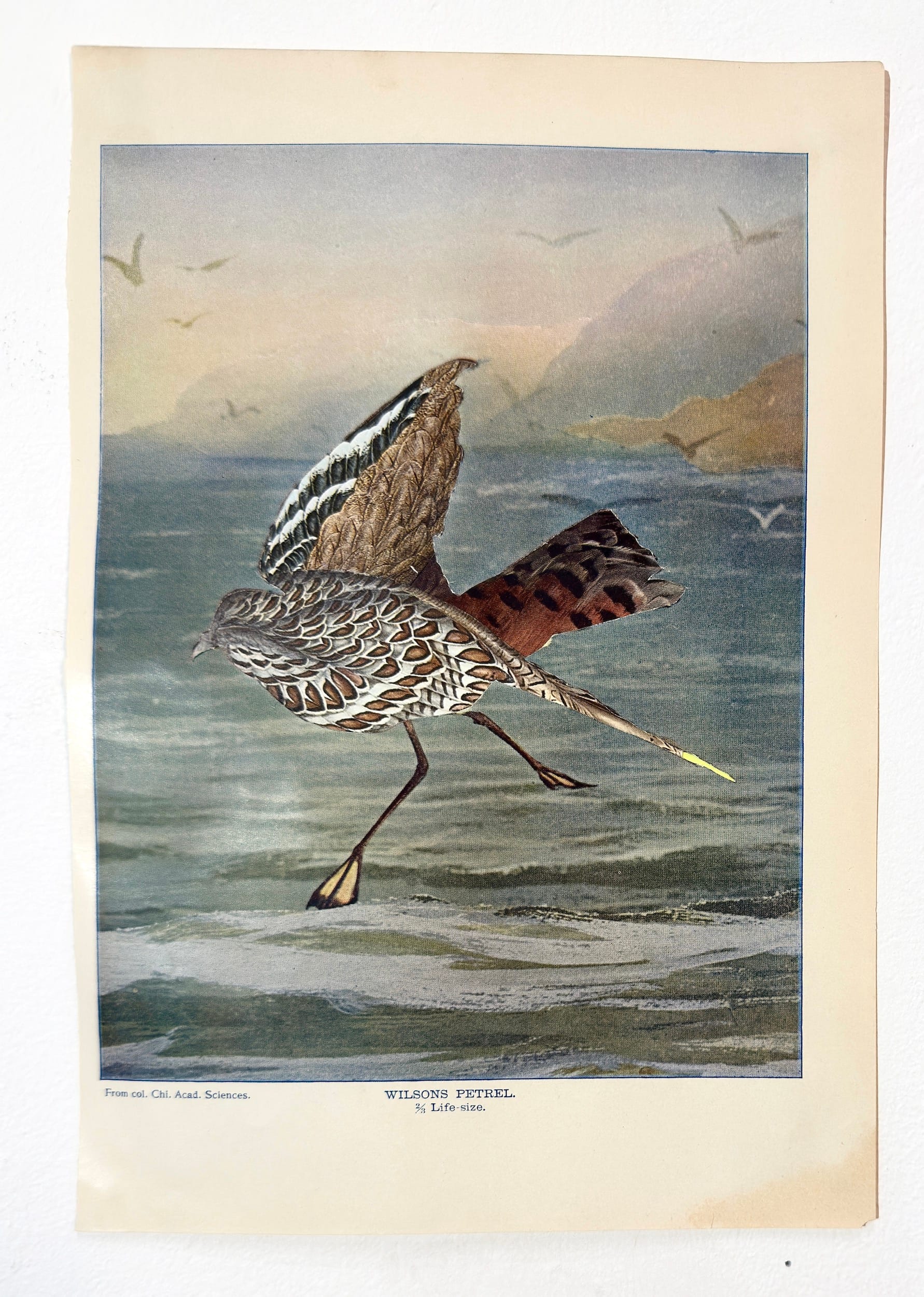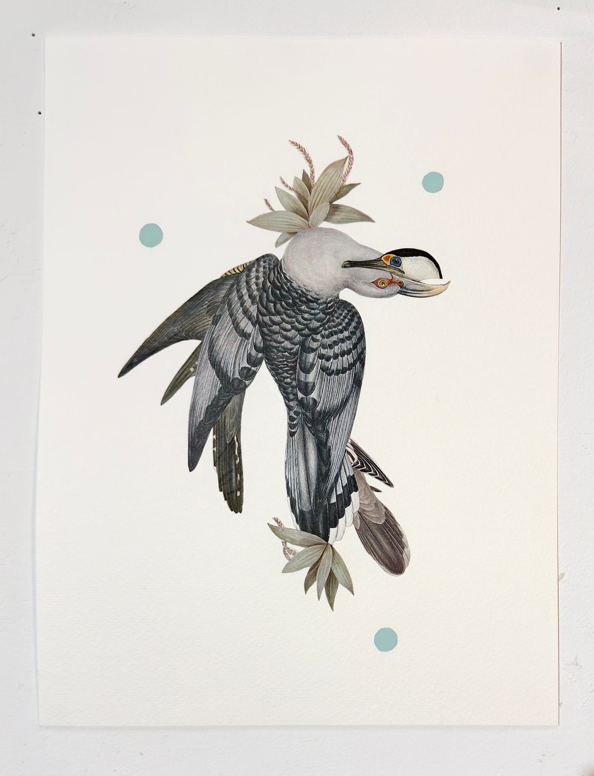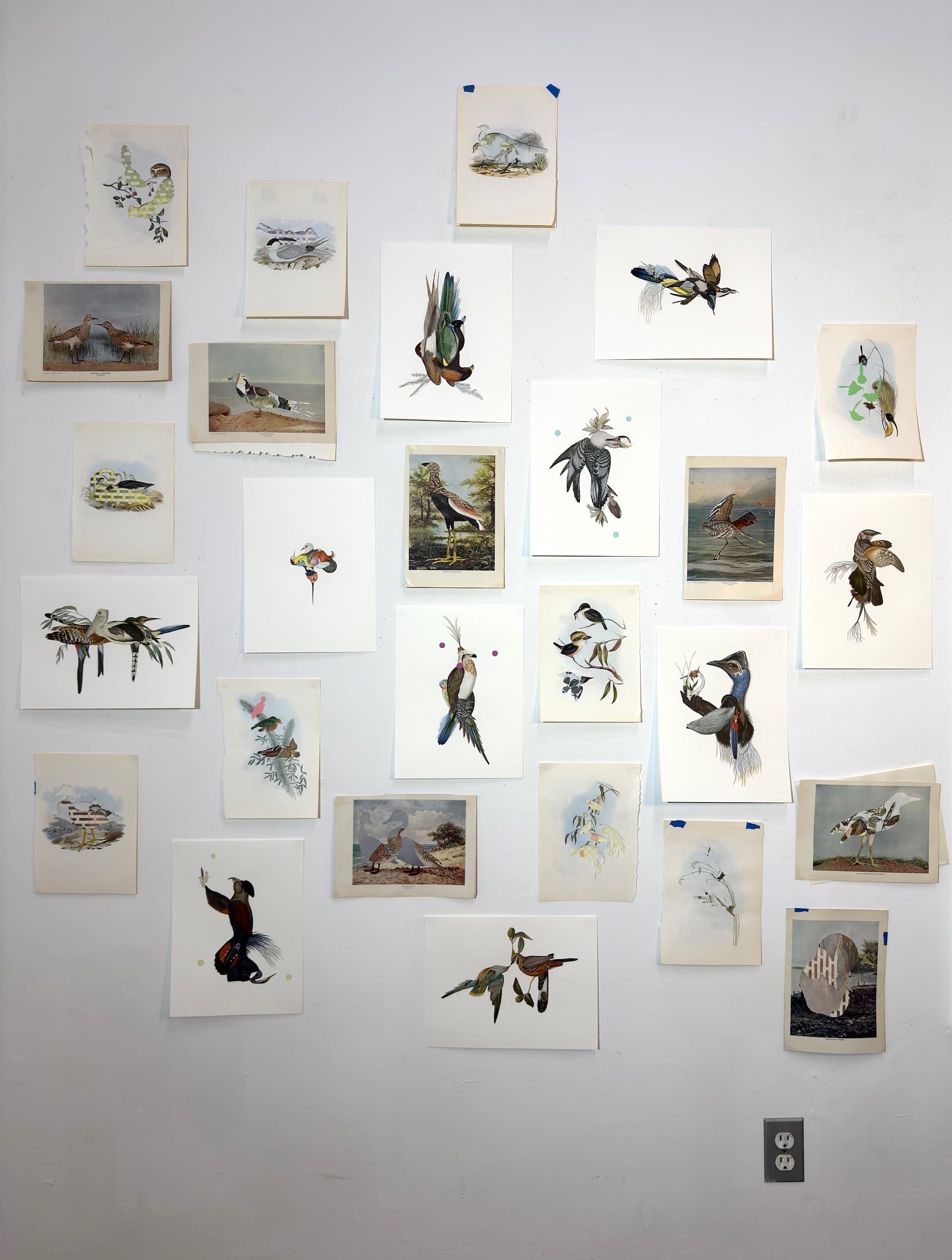 Cawthorn creates fantastical hybrids of birds from Australia and other parts of the world, which reminded me of Australia’s real and mythic hybrids, such as the duck-billed platypus and the Bunyip of Australian First Nations mythology. In some collages, after removing the original bird from the page, Cawthorn filled in the negative space with different anatomical parts. When she combines a bird native to Australia with one from the Eastern seaboard of the United States, she reenacts the migration of the songbirds from their native land to other continents.