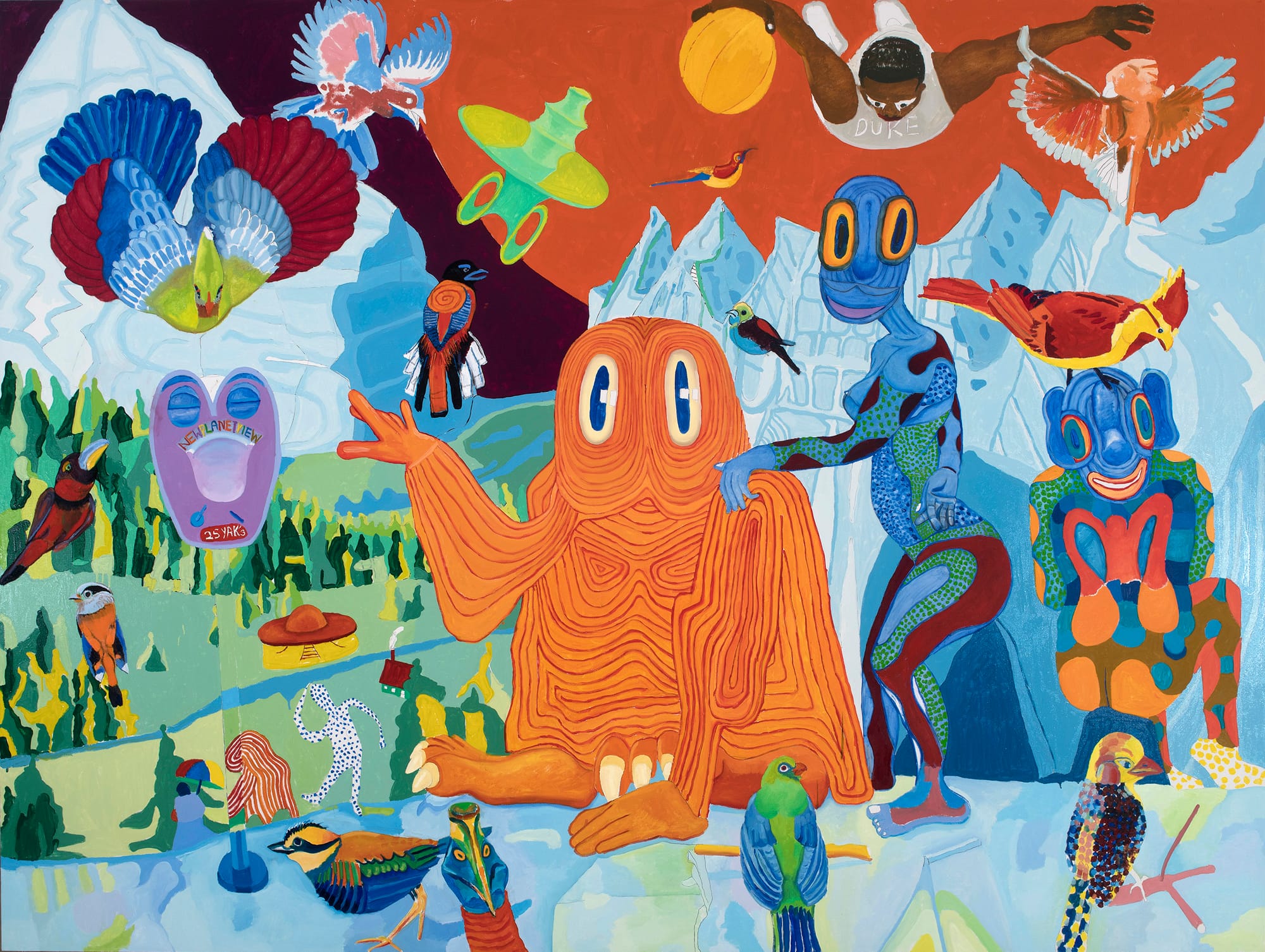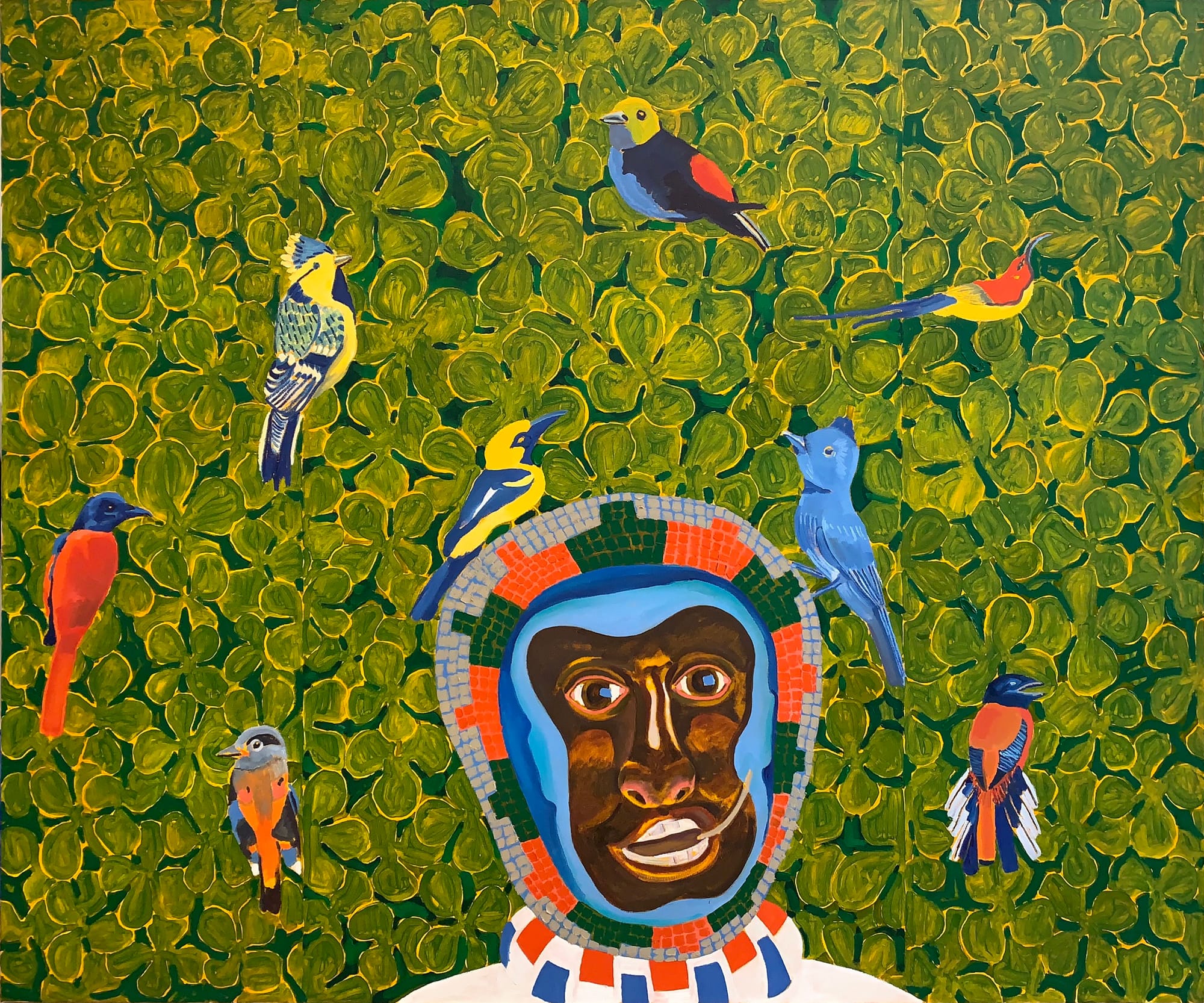 There is a cornucopia of things to look at and ponder in Williams’s new paintings, but I found myself preoccupied by the birds in two of his canvases, “Birdland” (2020) and “As the Birds Fly, Another Planet” (2019). Williams, an ardent birdwatcher, has put birds in earlier paintings. Beyond the obvious reference to Charlie “Bird” Parker, the birds in these new works remind me of Christian Cooper, a birder who came to unwanted fame this year after recording a white woman fraudulently calling the police on him in Central Park. “The birds don’t care what color you are,” Cooper told a reporter, and it occurs to me that these animals belong in Williams’s Afrofuturist world. The feathers of his birds abound in color and pattern, as do the astronauts flying like their avian cousins through half the paintings in this show. Only racism pigeonholes people with a single hue; we are all endlessly polychromatic in our skins, cultures, and personalities. Speaking about his approach to color during a 2020 conversation with critic John Yau, he commented, “It’s a formal kind of saying, ‘Here, this is part of my Negritude, part of the Negrosity that I have in my soul.’”