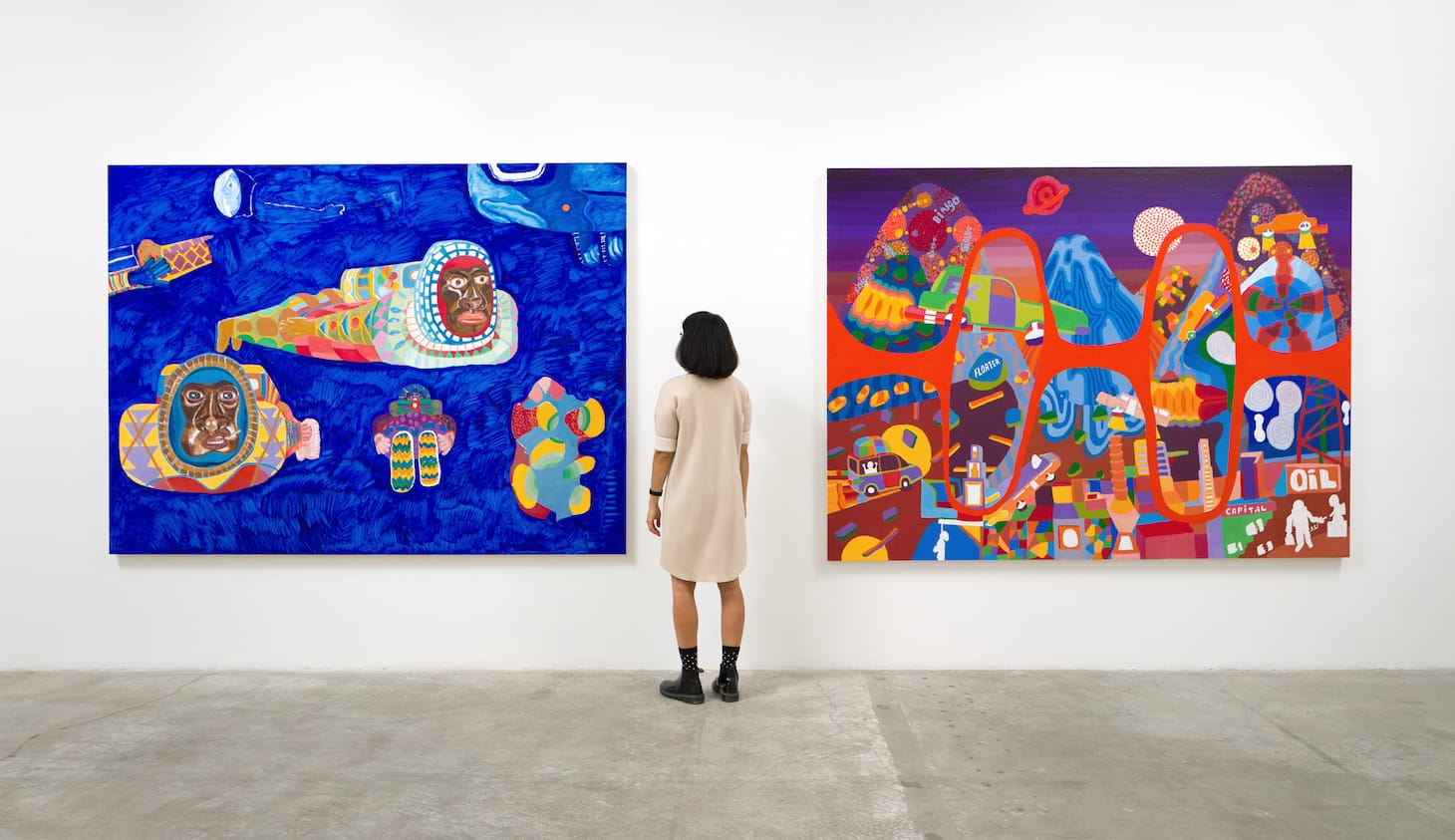 LOS ANGELES — Peter Williams has long engaged issues of American racism and the Black experience, and his new exhibition Black Universe at Luis De Jesus Los Angeles is no different: his paintings include flying cars, abstracted landscapes, snatches of text (“Trump,” “Wall Street,” “Lawyers,” “Floater,” and “Help” all appear), and Black astronauts whose need to wear helmets in space makes me think of the phrase “I can’t breathe.” Williams’s astronauts extend the Afrofuturist theme of escaping the minefields of racism — as he explained in an interview, the Black Universe series “started out with my decision to leave the planet and the way to do that would be to take my 12-year-old car down to Cuba and have them retrofit it and put on some rockets and stuff.”