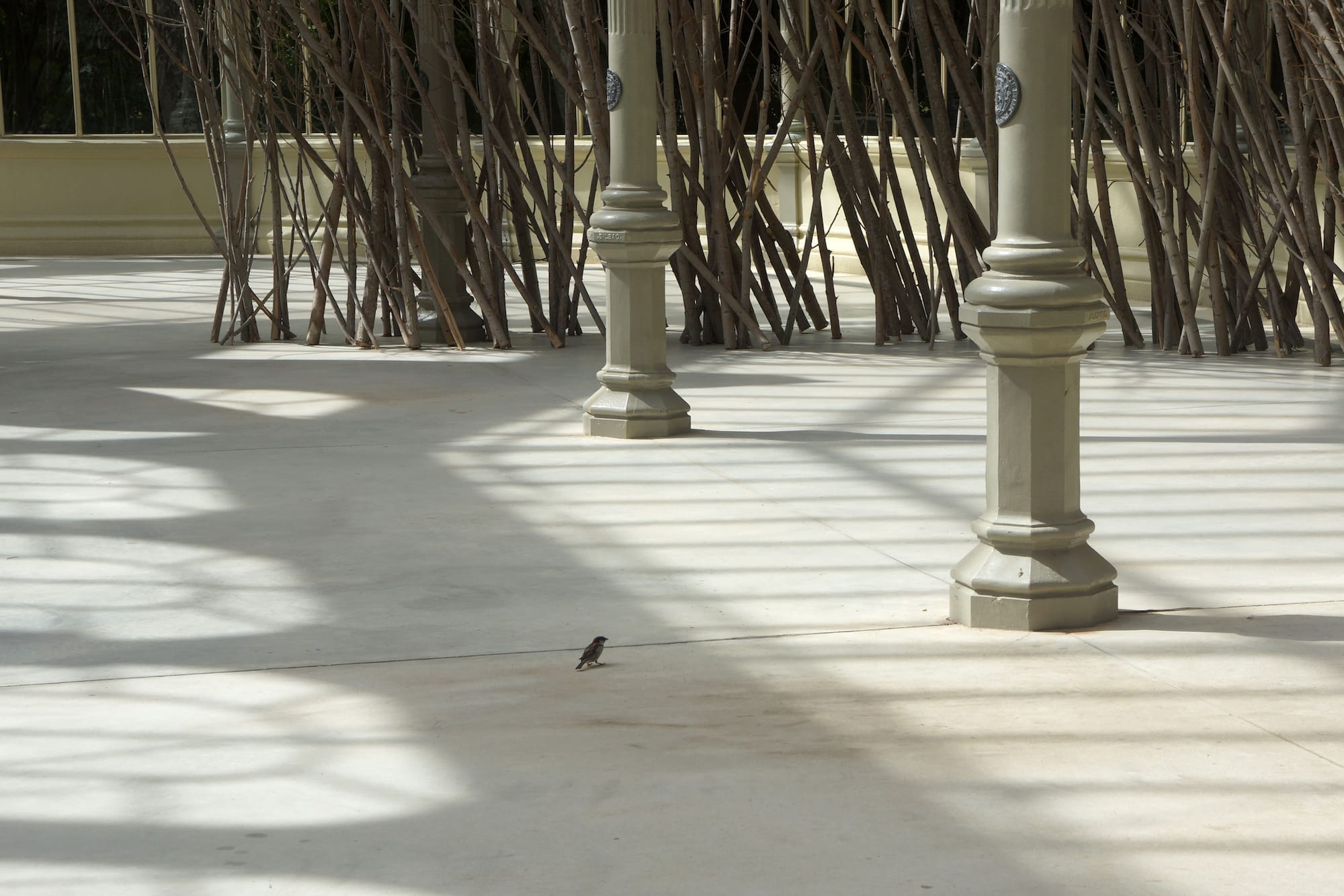 Upon entering, visitors veer left through a narrow tunnel of tall branches into the transparent, light-filled space. Enormous canvas-and-wire flowers hang from the columns and roof, and gargantuan, golden bird legs descend from the central dome to the floor. Yet the rest of the installation activates the perimeter: a mysterious, birdlike figure gazes north towards the chestnut trees, two other cloisters of branches line the palace’s symmetrical wings, and, most subtly, nine windows have been opened for the first time. Staff tell me they replenish feed on golden plates throughout the branches to attract so-far elusive birds. I remember a lone croon piercing the visitor chatter.