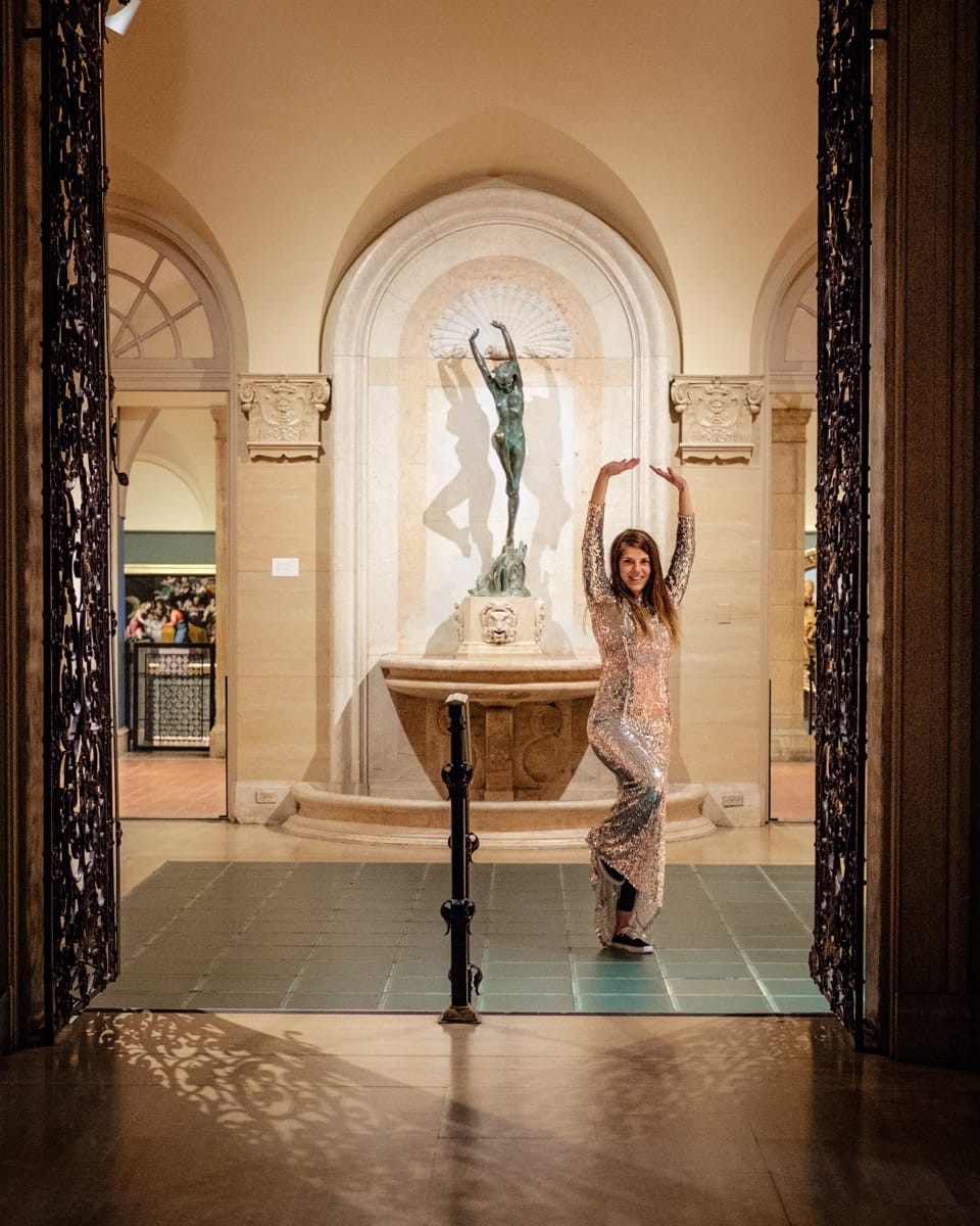 Earlier this month, #MeTimeMonday’s second participant, Lauren, dressed up in a sparkly silver dress especially for the occasion. “Wandering the museum without people to dodge, crowds to negotiate, I discovered many things I hadn’t noticed before,” she wrote in her recap. “I walked in and immediately, all of my attention went to what I consider to be the star of the show — ‘Phenomena Break Silk’ by Paul Jenkins. I spent the next hour or so reading all about Paul Jenkins, his influences, his mild eccentricities, and anything else I could find. I continued following link after link as I made my way downstairs and into the Museum Confidential exhibit, where a local bluegrass band was going to play a few songs for the Philbrook social media feeds.”