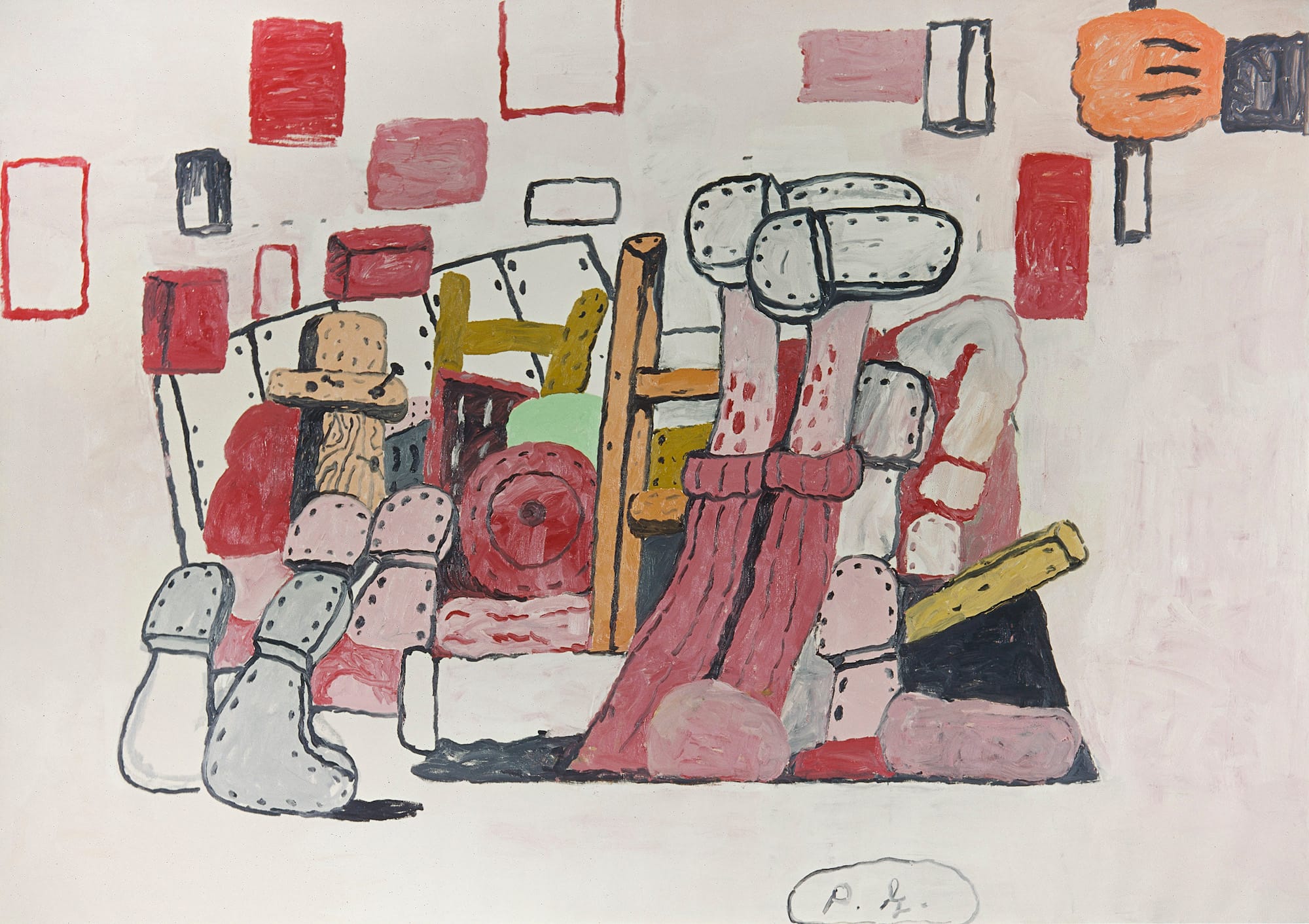This partial list testifies to the 20th century’s domination by genocidal policies and struggles for freedom and liberation. Alongside these histories, we must place this aesthetic chronology. When he was 13, Guston’s mother enrolled him in a correspondence course run by the Cleveland School of Cartooning. He began reading comic strips, including George Herriman’s Krazy Kat and Bud Fisher’s Mutt and Jeff. He met Jackson Pollock (1912-1956) at Manual Arts High School in Los Angeles, but was expelled and never returned; he also met Reuben Kadish (1913-1992), who attended a nearby high school. In 1930, he received a scholarship to attend Otis Art Institute in Los Angeles, but he dropped out after three months. He began going to the Los Angeles Public Library to familiarize himself with reproductions of Michelangelo's drawings, Mantegna's prints and paintings, and the frescoes of Giotto, Masaccio, and, above all, Piero della Francesca. At the home of Walter and Louise Arensberg, he saw the paintings of Giorgio de Chirico and other modern European artists for the first time. Kadish introduced him to Lorser Feitelson (1898-1978), who had studied art in Paris and had firsthand experience of Cubism and Surrealism. Feitelson wanted to make rational use of the irrational elements and associations of Surrealism while rejecting Automatism as a process. Guston remembers Feitelson talking to him about Tintoretto and Raphael and encouraging his pursuit of Michelangelo.