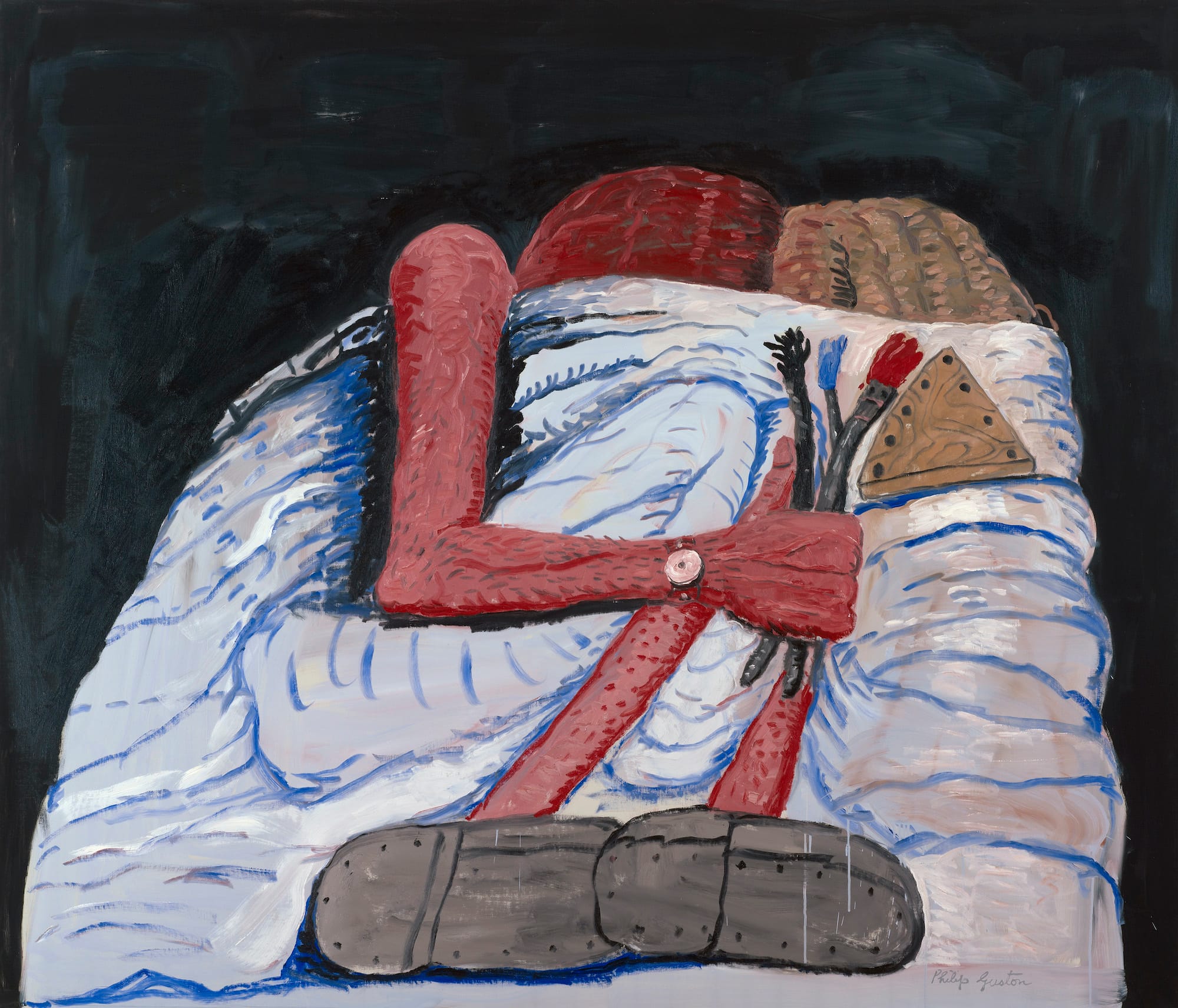 In the last eight years of his life, the paintings poured out of him, as piles of limbs, bugs scrambling down rocks, spiderwebs ensnaring his and his wife’s heads, pits filled with body parts. In “Painting, Smoking, Eating” (1972), he is a young man lying in bed, a plate of unappetizing french fries balanced on his blanketed chest. Behind him, spanning almost the entire canvas, are a pile of shoes, a paint can, and what might be a canvas. On the far right, the cord and round handle of the window shade suggest a noose. In “Couple in Bed” (1977), he is an old man lying in bed with his wife, clutching paint brushes, his shoes still on in case he is summoned by his ghosts in the middle of the night. Guston wanted to keep looking at the doomed, changing world until he died, and he did. He wanted us to know that you could keep your eyes open, no matter what. That’s what the museum did not celebrate.