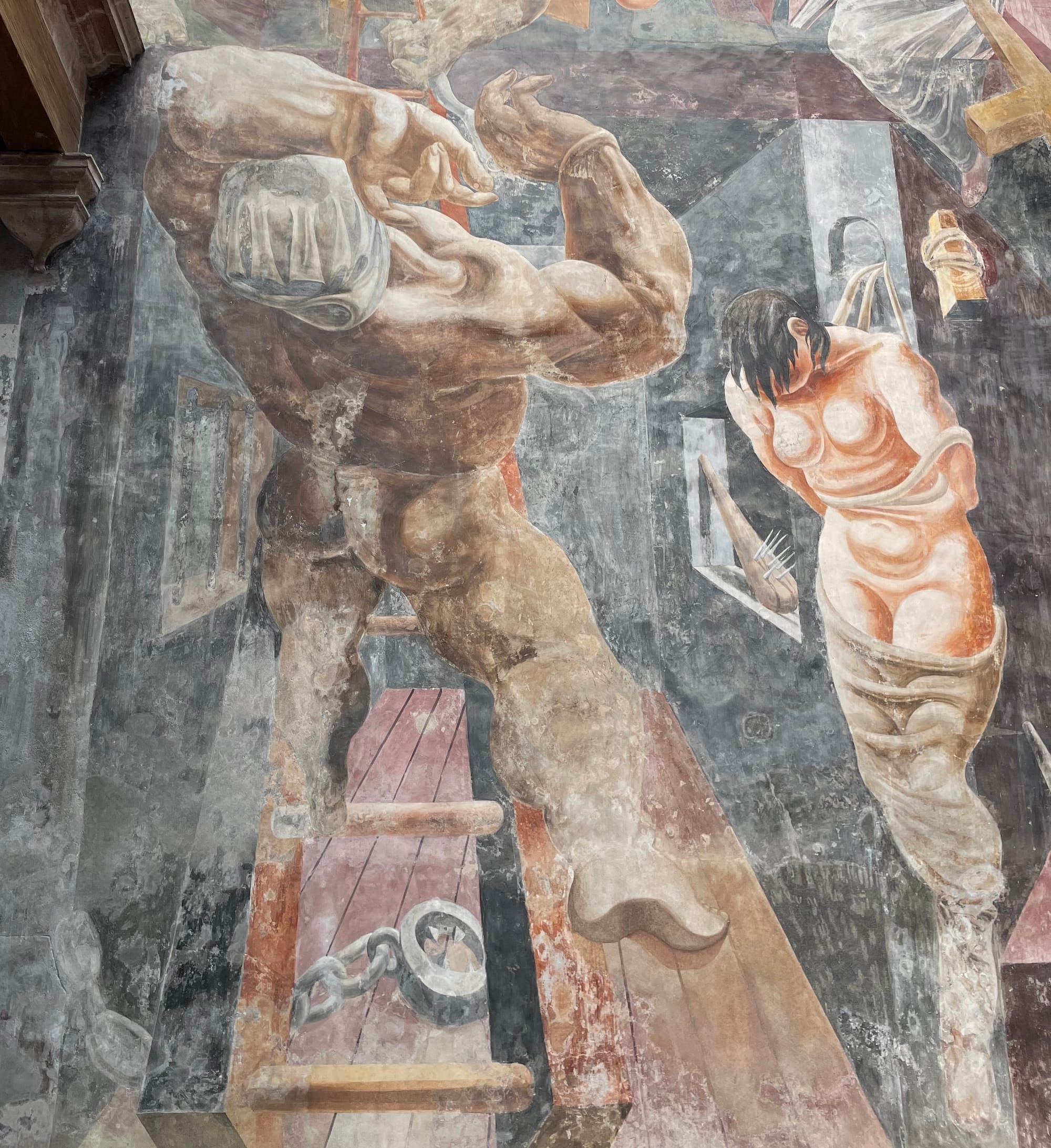 Guston created the 1,000-square-foot work, his first major commission, with fellow painter Reuben Kadish when they were both barely in their 20s. On the invitation of Mexican muralist David Alfaro Siqueiros, the two traveled to an 18th-century Baroque palace in Morelia, Mexico, where they spent six months working on the mural with the assistance of poet Jules Langsner. The result was a massive fresco packed with ominous depictions of violent repression and historical struggle that stretched across a two-story wall and reflected scenes of religious persecution and racial terror that the artists, both children of Jewish immigrants, had witnessed in the United States and abroad with the rise of the Ku Klux Klan and the Holocaust.
