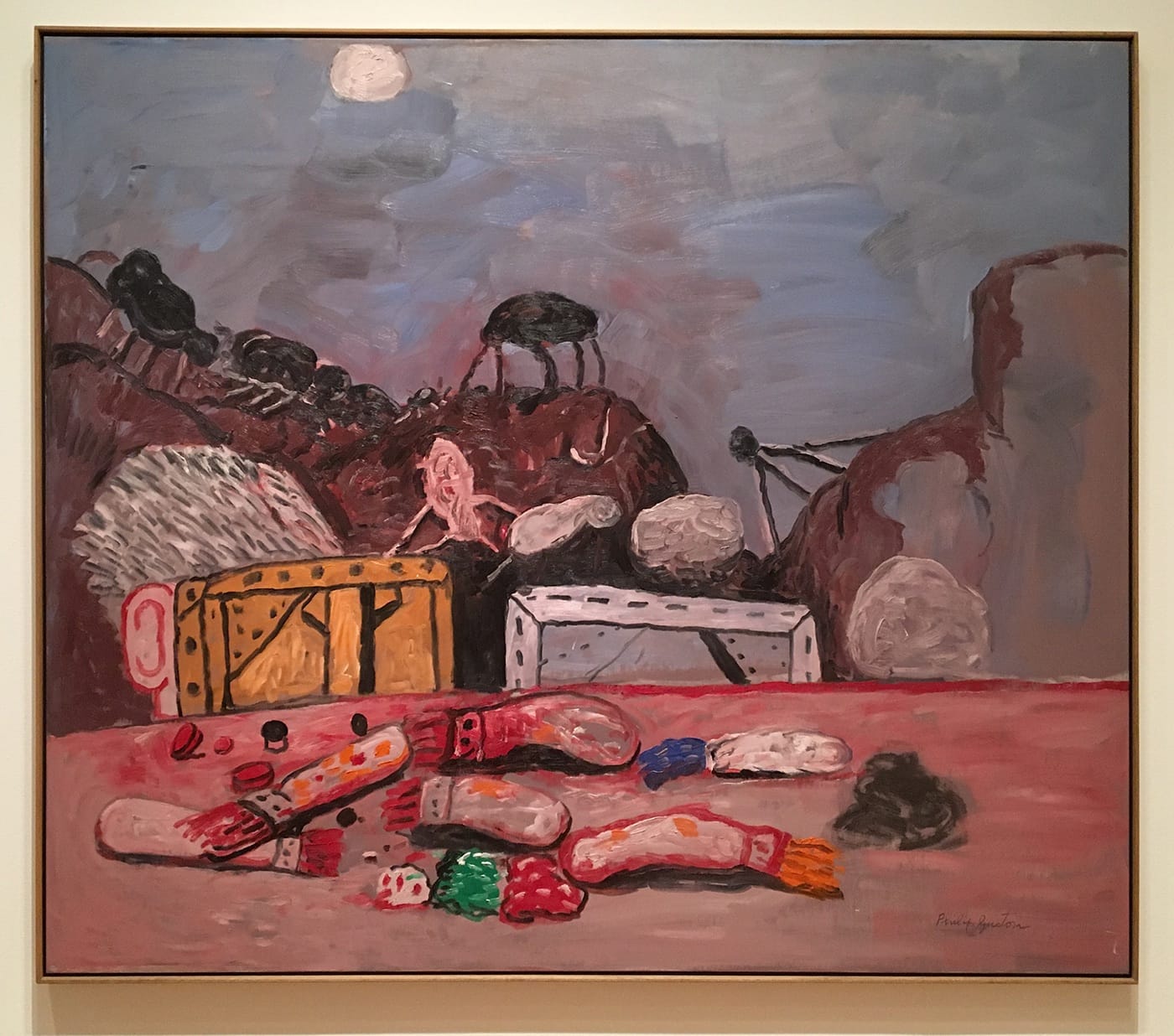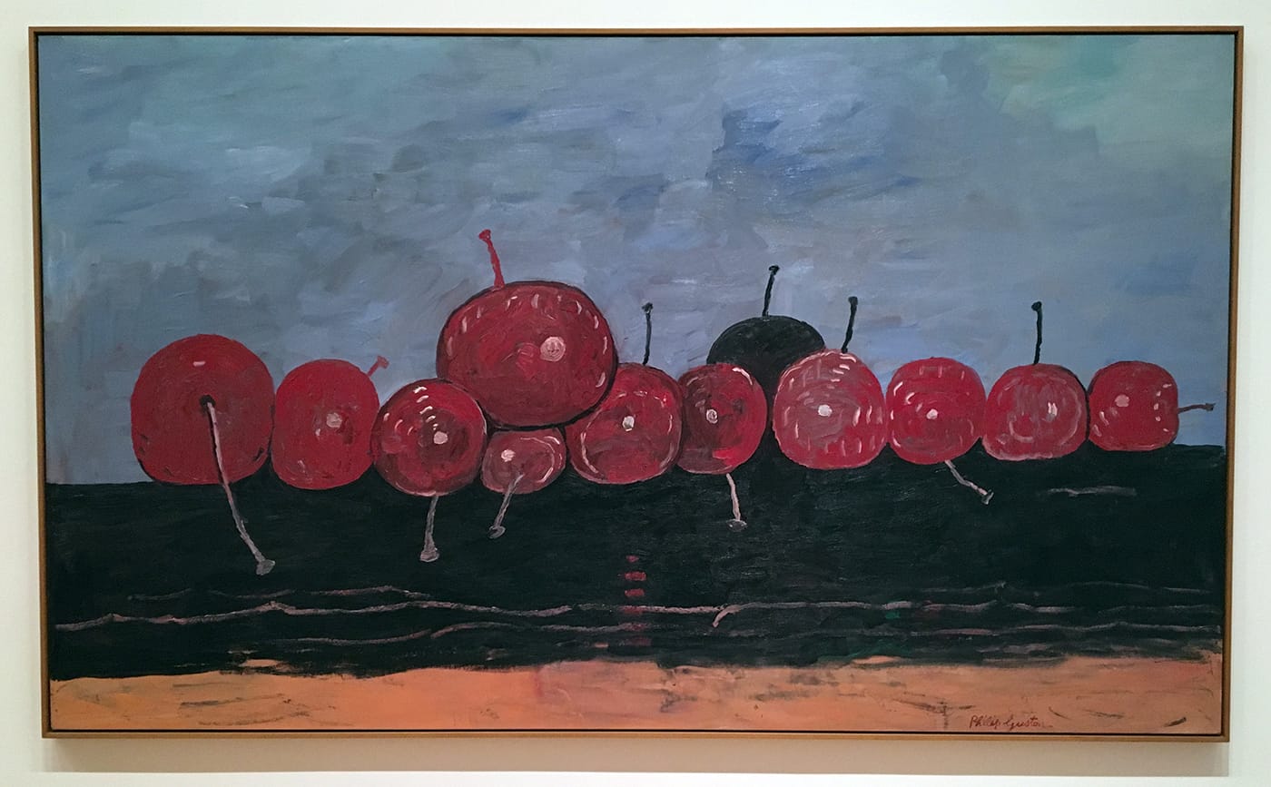 With Guston, the titles often tell us where and how to look. One of the more fascinating, and de Chirico-esque, paintings on display combines aspects of still life, self-portraiture, and landscape. The foreground is littered with paintbrushes that look more like cigarette butts than anything else (Guston’s twin addictions?) along with white, green, and red lumps of paint (the colors of the Italian flag.