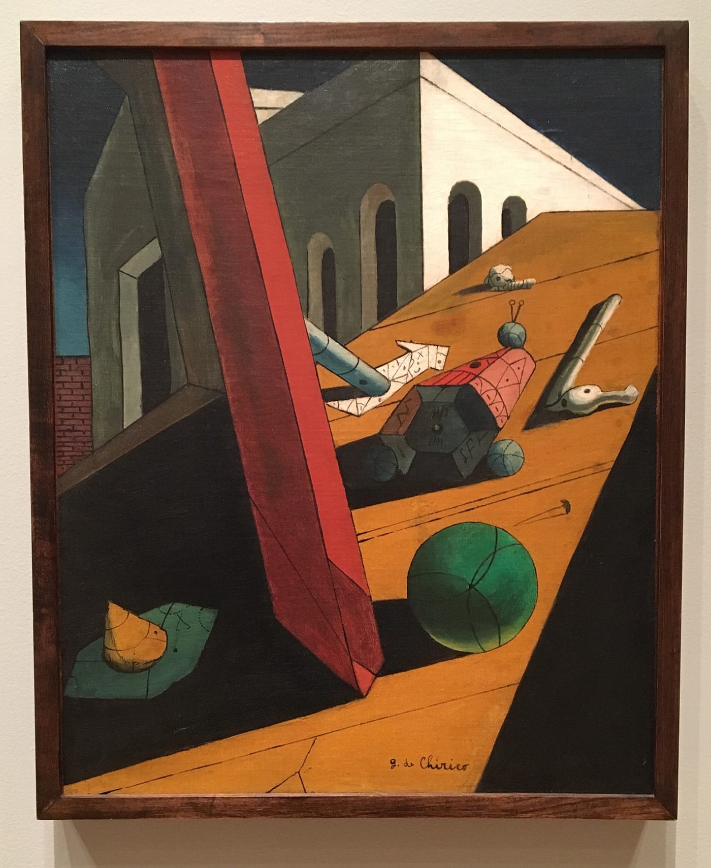 Another, more particular connection between the two men is their nuanced manipulation of the visual-verbal continuum. The importance of the word is expressed in de Chirico’s work by the slippery relationship between his titles and the paintings they describe, at times augmenting the imagery (“The Enigma of a Day,” “The Serenity of the Scholar,” both 1914) and at others importing parallel sets of meanings from outside the frame (“The Evil Genius of a King,” 1914-15; “The Nostalgia of the Infinite,” ca. 1912-13, but dated 1911 on the painting).