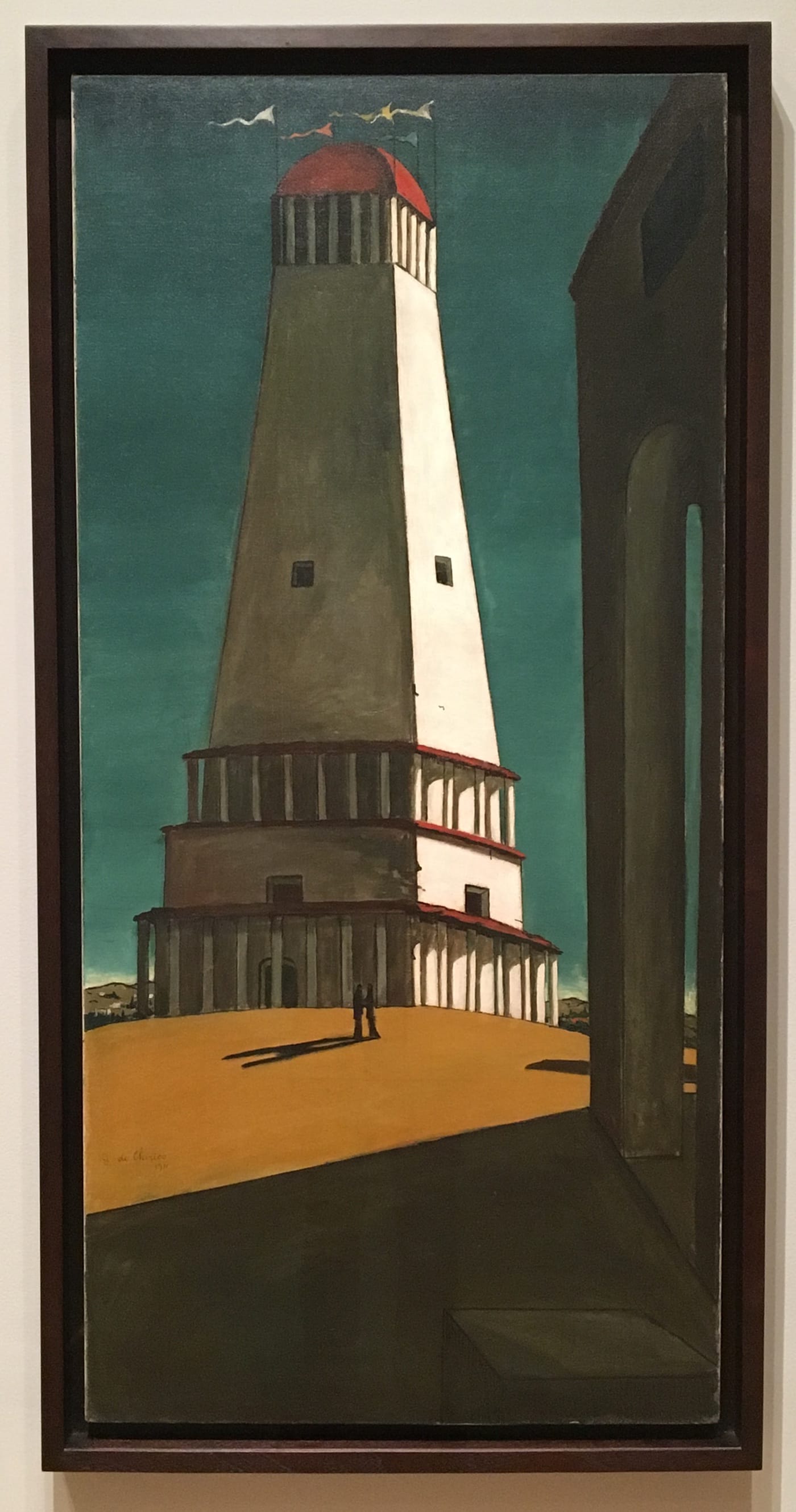 Behind these tools of the trade, which also seem to include a scattering of pills, the artist is at work on two canvases, their backs turned to the viewer. His face is hidden by one of them, with only his ear, neck, and hair visible, while the canvas itself, graphically rendered in black on ochre, could have fallen straight out of the still life-cum-cityscape, “The Evil Genius of a King,” in which de Chirico uses the same colors to paint a tilted tabletop. White puffs of what could be cigarette smoke, drifting off to the right of the painter, or clouds encircling a muddy mountain range in the distance, recall the steam pouring from the locomotive’s smokestack in de Chricio’s “The Anxious Journey” (1913), also in MoMA’s collection. Topping off the inscrutable imagery is a short convoy of what appear to be giant black ants creeping along the mountain ridge behind the artist at his canvas.