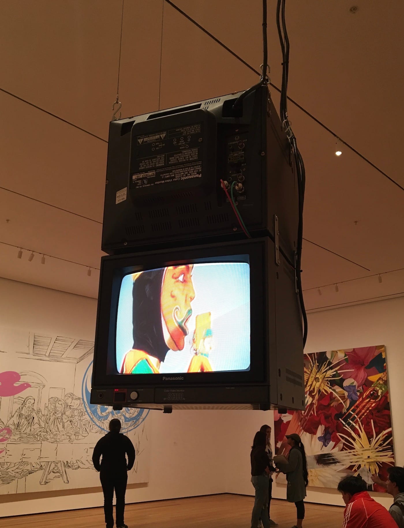 But this is minor compared with the intentionally grating audio from Bruce Nauman’s ceiling-mounted, double-sided video, “Dirty Story A/B” (1987), which manages to bleed across two galleries and trash the meditative atmosphere of Agnes Martin’s sublime pale-blue-and-sand-yellow six-part painting, “With My Back to the World” (1997). While Nauman’s volume level is intrinsic to its can’t-play-well-with-others ethos, it creates a condition in which Martin’s work is fundamentally undermined, making it impossible to perceive it as she intended. (The soundtrack for Joan Jonas’s glistening, room-sized video/sculpture installation, “Reanimation” (2010/2012/2013), however, sited in one of the last galleries of the exhibition, did not present similar disruptions to its neighbors.)