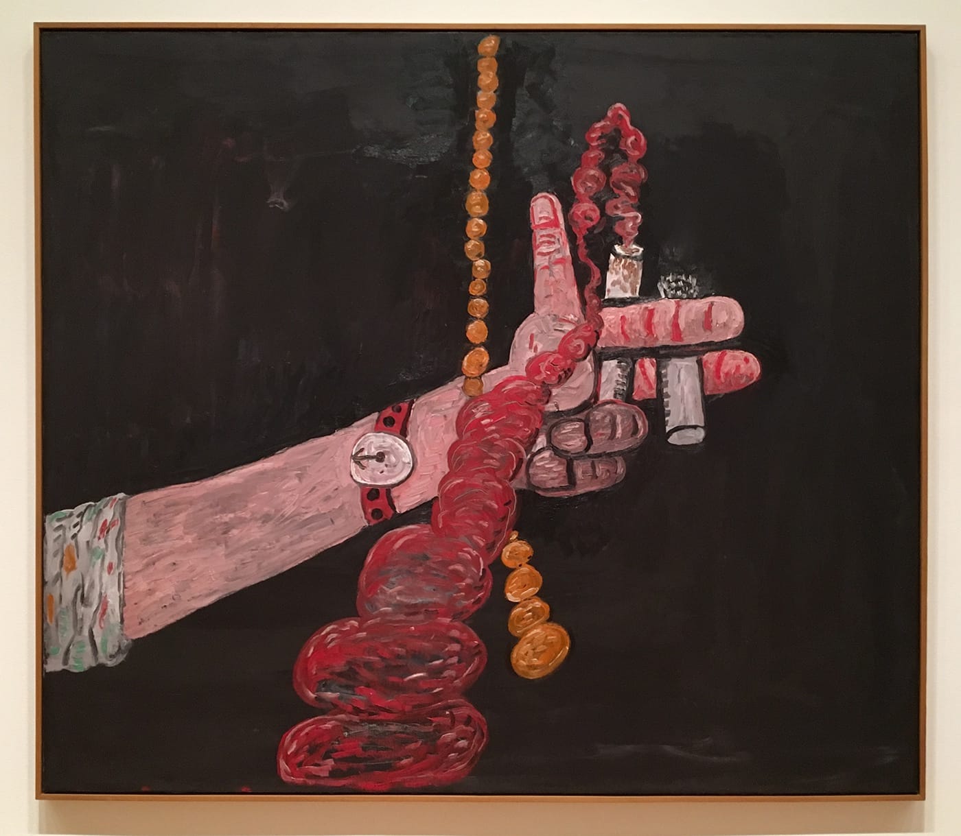 The only other element is a chain, presumably from a hanging lamp, dangling from the center of the canvas’s top edge, further underscoring the impression of a spotlit night scene. What’s baffling about the picture is that the cigarette smoke, after rising a couple of inches, abruptly shifts downward in defiance of the law of gravity, until it disappears below the bottom of the frame. This doesn’t make sense until we read the label and learn that the title is “Talking” (1979), and that the smoke trailing from the cigarette is following the movement of the otherwise unseen artist’s arm as he gesticulates while conversing with an unseen guest. It’s a peculiar, to say the least, specificity of detail, but its off-kilter dance with signification opens up the mind to questions that a more straightforward depiction of human interaction would preclude. Like Breath, like “The Evil Genius of a King,” we witness something, but its meaning is offstage, implied, definitely somewhere else.