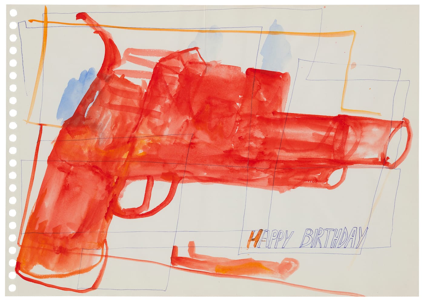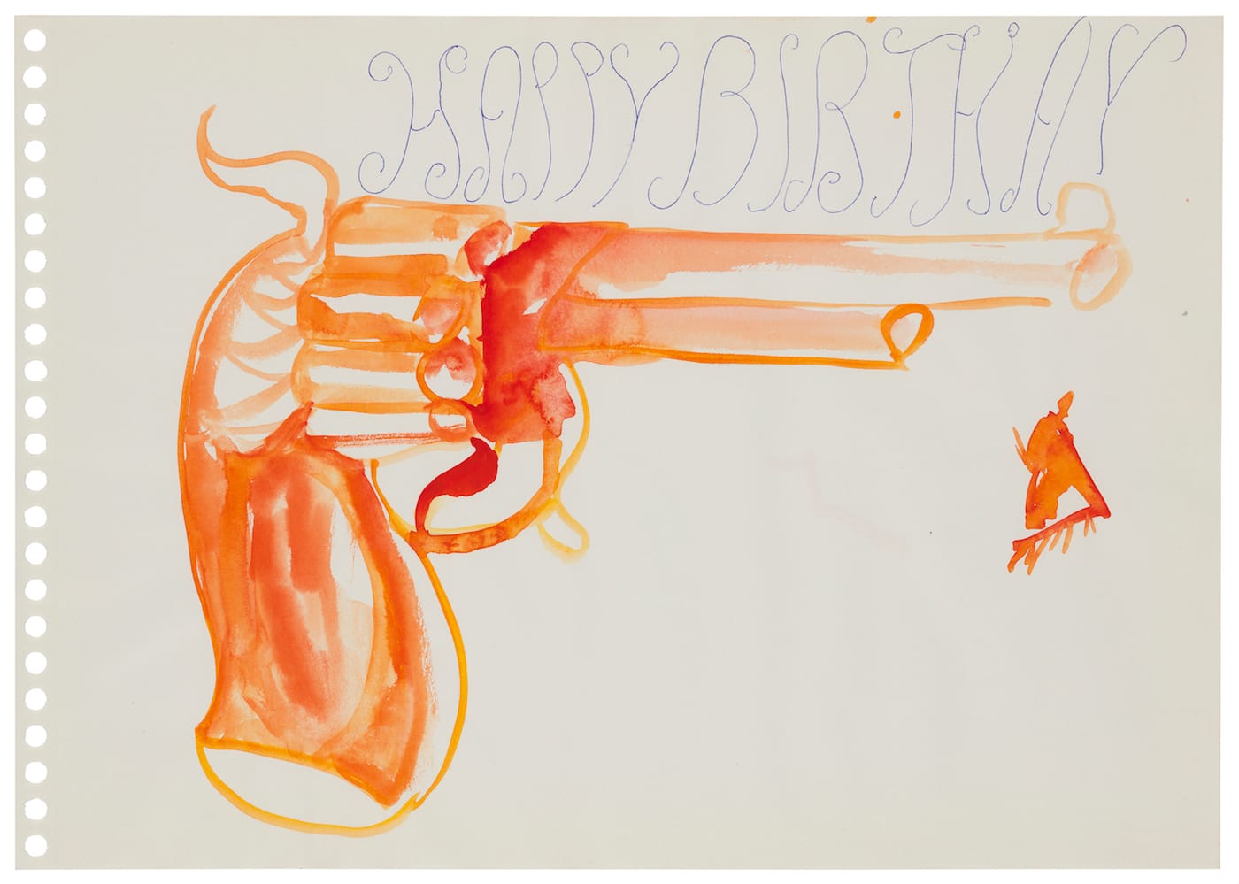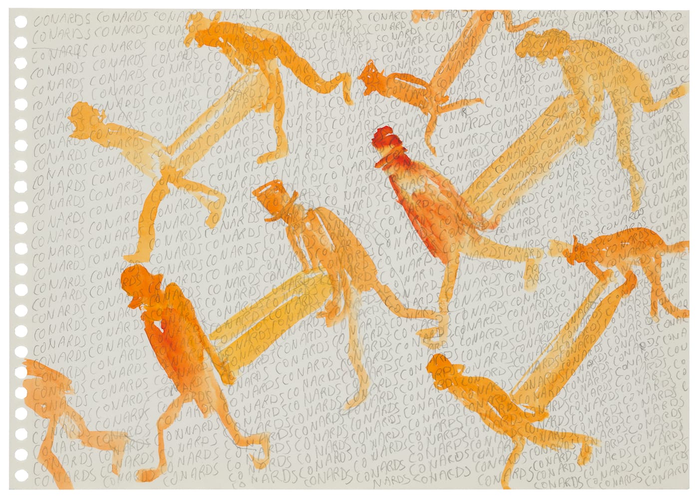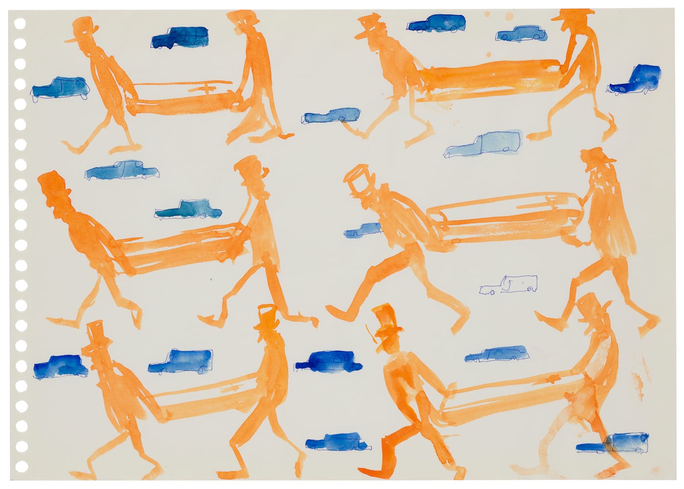 In a number of sketchbook drawings, the artist writes “Happy Birthday” above the watercolor of a gun. (In the film, we see the actual gun lying on his studio table). In another grouping of drawings that combine different media, including ballpoint pen and watercolor, the artist creates a schematic cutaway view of streets, buildings, and stairs. Two men in bowler hats (descendants of Magritte’s anonymous figures) carrying a coffin, thanks to the perspectival ambiguity, could be trodding through the streets or up or down a set of stairs. In other drawings, there is a whole gaggle of men in bowler or stovepipe hats running through the streets in pairs, carrying coffins. There is no place to put all the dead, it seems. If you cannot hide them in art, where can you hide them? These works alone won me over, as well as piqued my curiosity to know more about the artist.