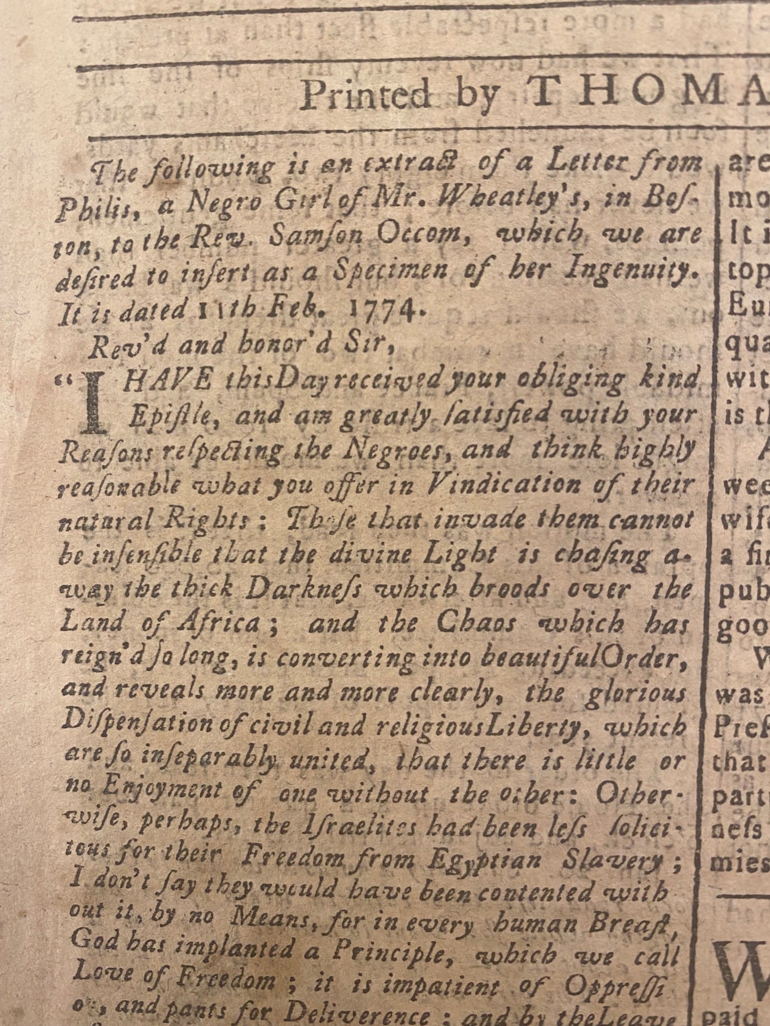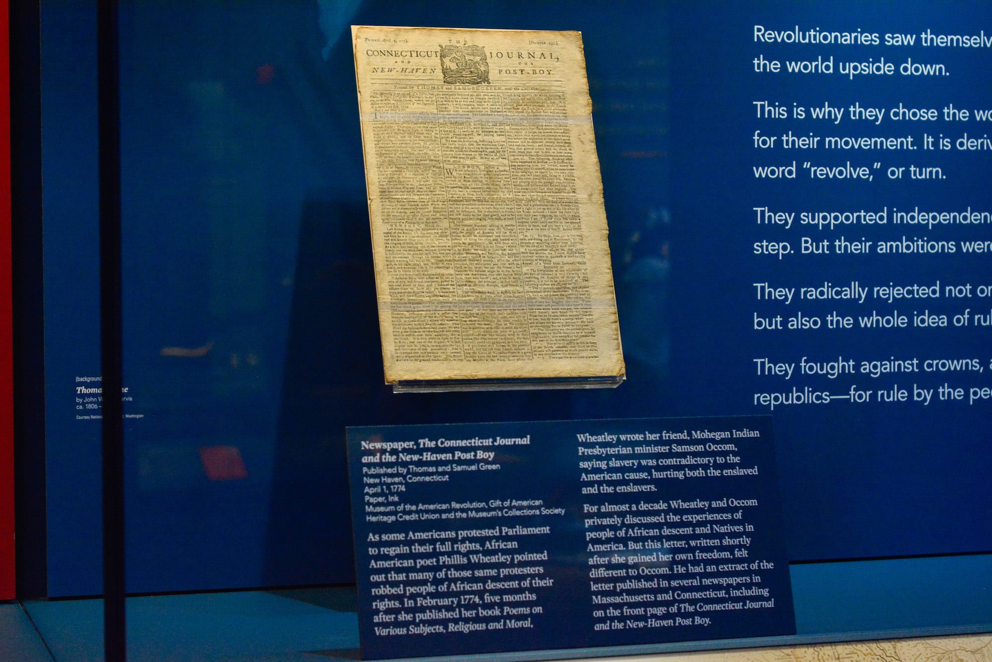 The Museum of the American Revolution in Philadelphia has recently acquired an original April 1, 1774 Connecticut Journal newspaper reprinting a letter from recently manumitted poet Phillis Wheatley to Mohegan Indian poet and Presbyterian minister Reverend Samson Occom.