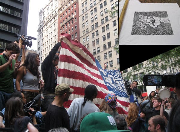 Ed. note: And she spotted this flag being held up by artist Jon McCarthy she interviewed on September 21 or Day 5 of Occupy Wall Street. We’ve juxtaposed the image with his original linocut print, which we published last week.