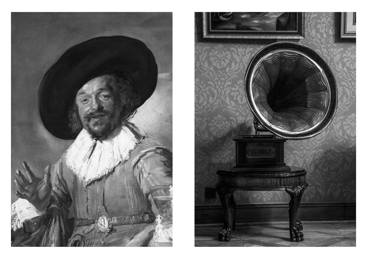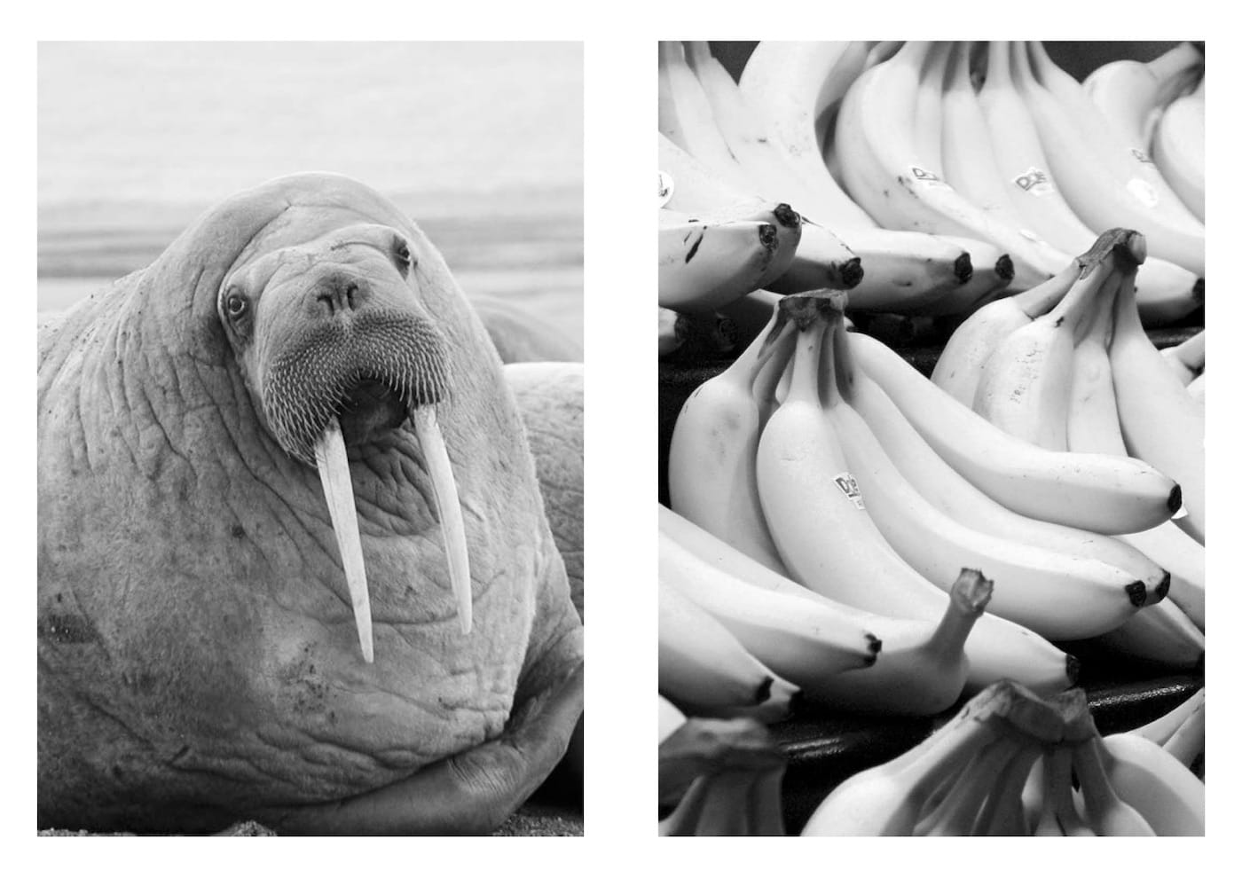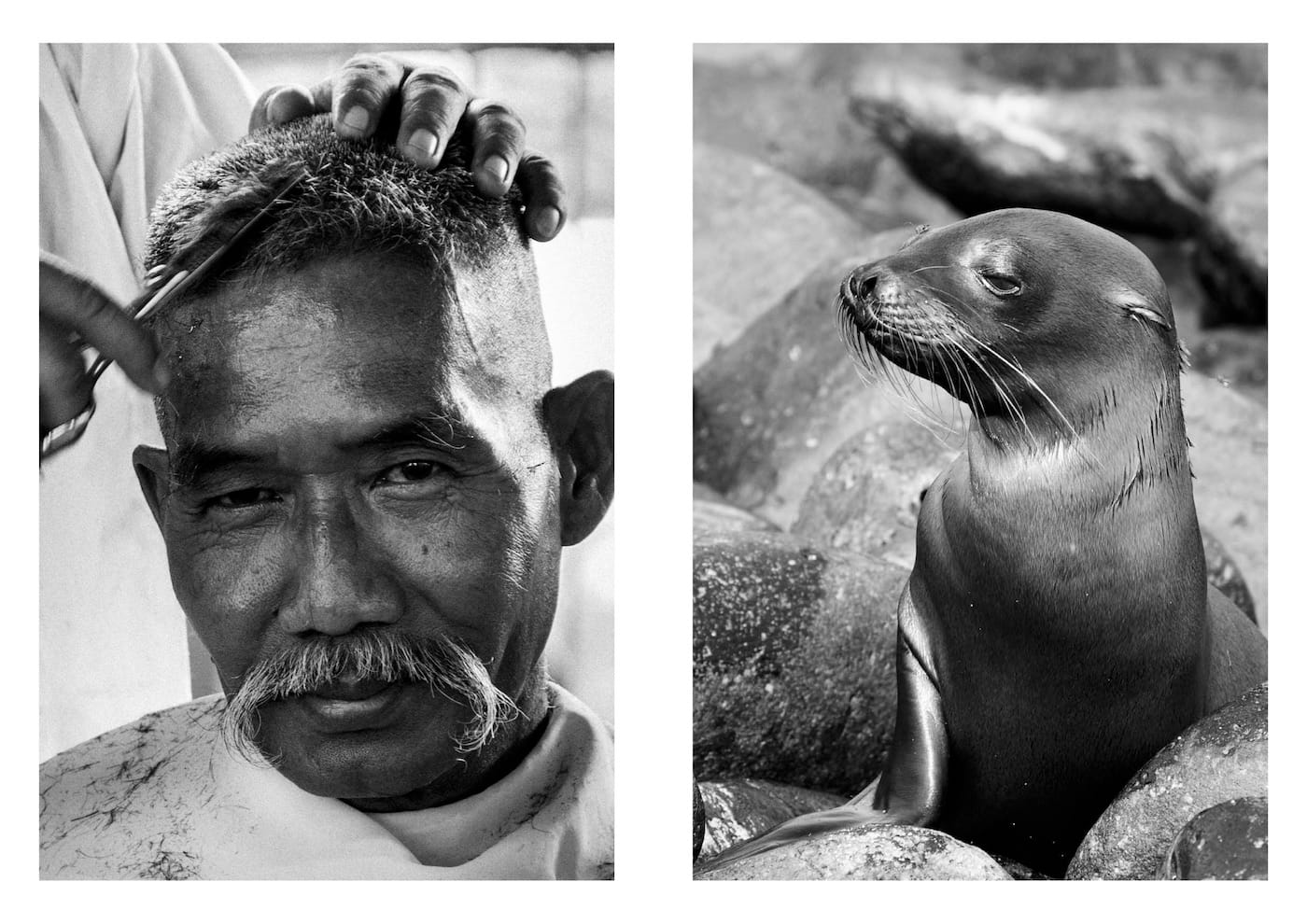 Some record famous paintings or monuments, others show animals, food, or smiling individuals; Aëgerter was mostly concerned with finding images that stimulate a positive reaction in a viewer. She then coupled them to create matches based on shared compositions, shapes, textures, and surprising resemblances in subject matter. The resulting visual dialogues are charming: the whiskers of a man getting a haircut are similar to those of a portly seal; the dangling tubing of a stethoscope echoes delicate carriage reins that decorate a clock.