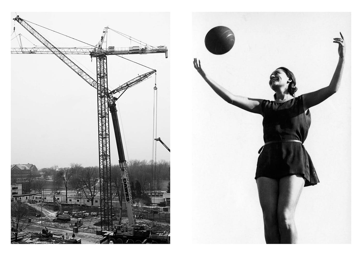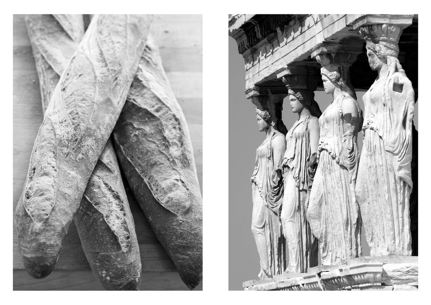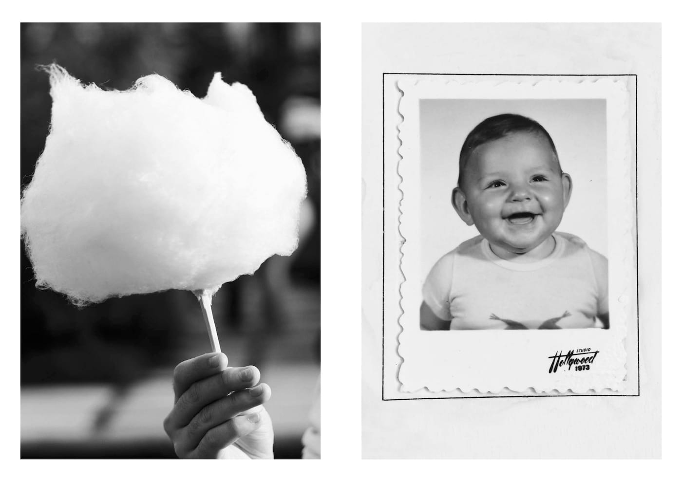 Some record famous paintings or monuments, others show animals, food, or smiling individuals; Aëgerter was mostly concerned with finding images that stimulate a positive reaction in a viewer. She then coupled them to create matches based on shared compositions, shapes, textures, and surprising resemblances in subject matter. The resulting visual dialogues are charming: the whiskers of a man getting a haircut are similar to those of a portly seal; the dangling tubing of a stethoscope echoes delicate carriage reins that decorate a clock.