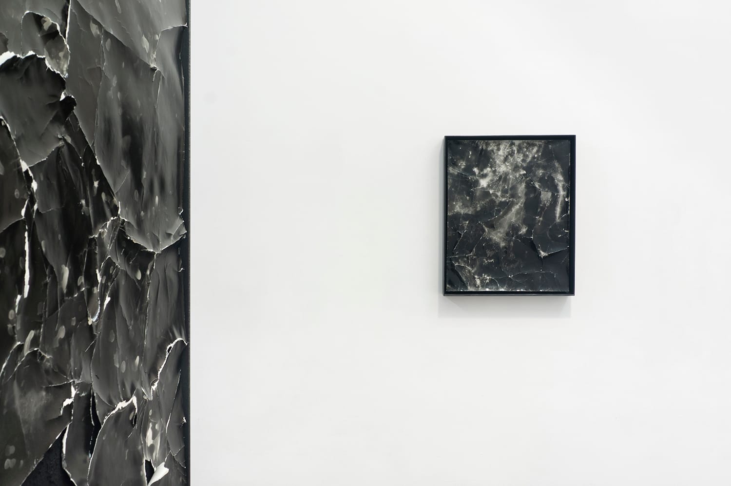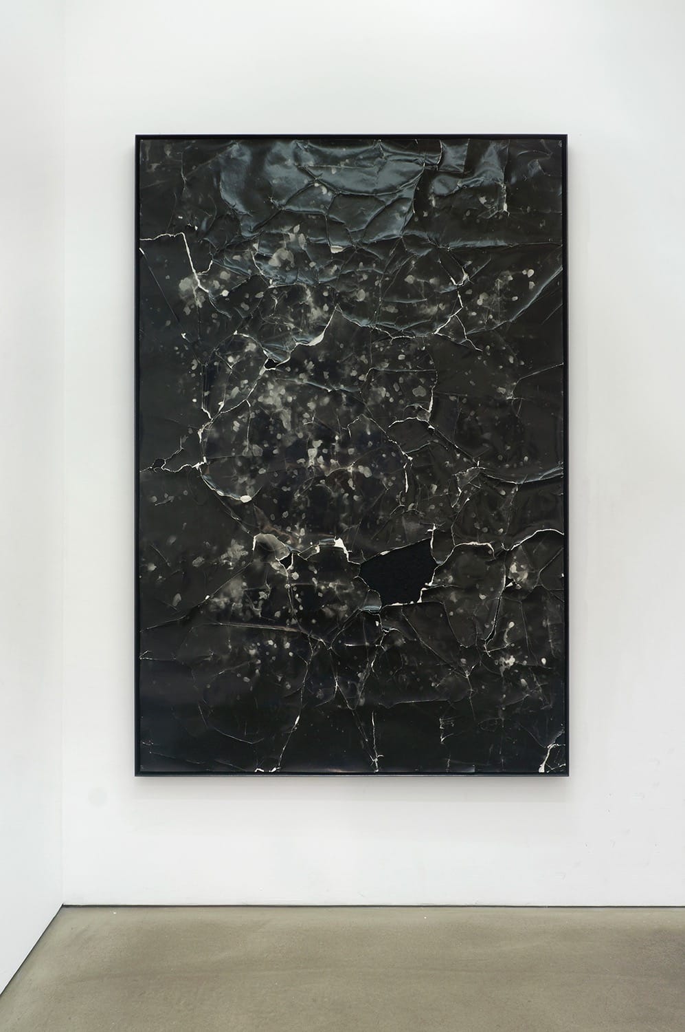 In Dark Waters there are three pieces: a very large photogram, “Full Moon Rain No. 3,” (2016), and two smaller ones, “Central Park No. 5” and “Central Park No. 26” (both 2015). They are all inhabited by black-and-white, craggy, jagged nebulae in oceans of darkness, a kind of roiling disquiet erupting through the actual medium. This eruption occurs as Flomen distresses the paper and the resultant creases and tears create rocky surfaces that remind me of Alberto Burri’s craquelure pieces. But in “Full Moon Rain,” Flomen has completely removed one chunk of paper and this gesture is also telling. I see his interest in what’s on the other side of the image — what had quiescently existed before he came along — and I see he wants to devise a way through to that place. I look at the hole in the piece. Underneath is a deeper darkness, pebbly and rough. Flomen looks for this place, which is like the underside of a hidden moon.