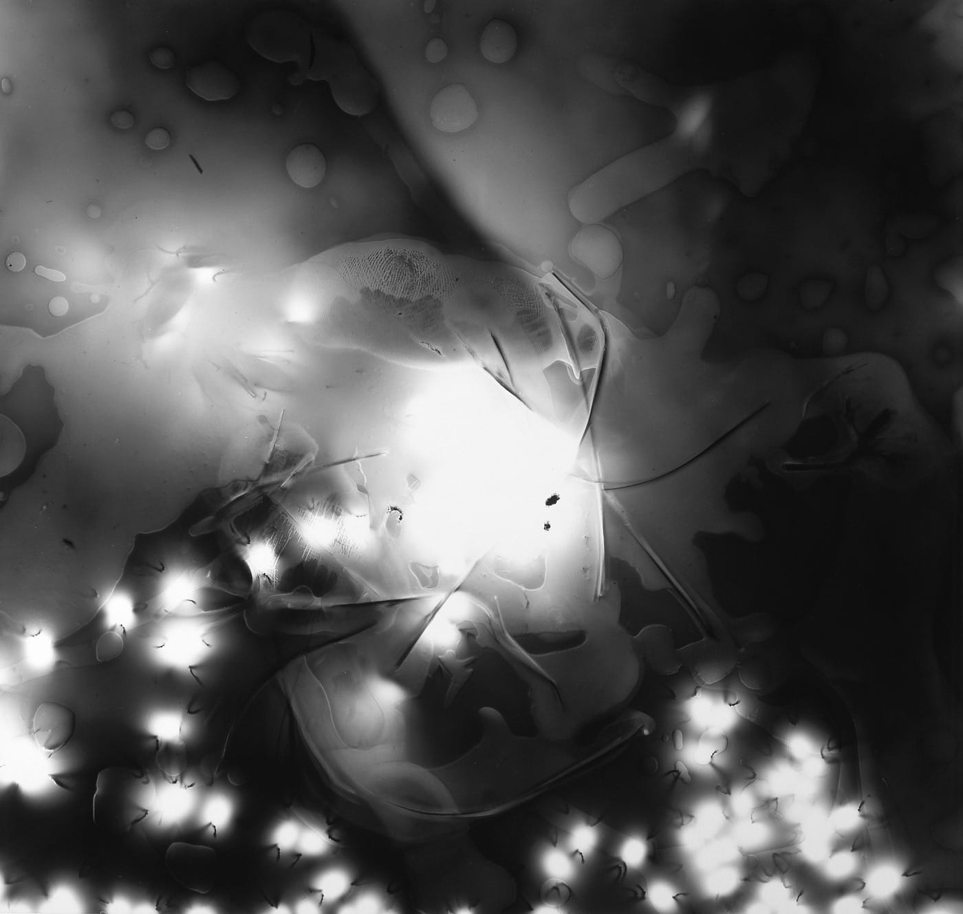 The artist, Michael Flomen, tells me that the piece, “Two Step” (2004) was part of a series of breakthrough images for him — photograms that are in conversation with natural elements such as rain water, earth, and plant life. “Two Step” was produced through a kind of dance between him and the fireflies over an 8-by-10-inch piece of film. He tells me: “The negative is completely illuminated by the beetle’s bio luminescent flashes.” But it looks like the faerie sparked into being and winked out, leaving a thirsty void after.
