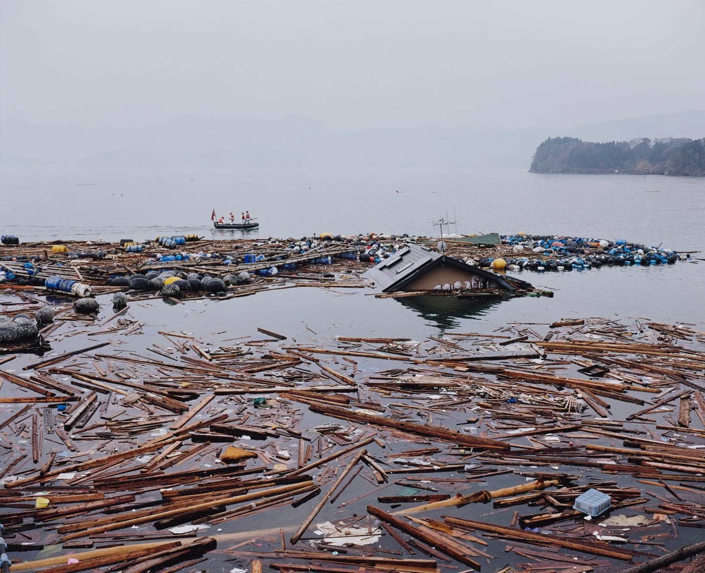 And yet, nature has a way of laying its own claim, as evidenced by Hatakeyama’s documentation of the earthquake and tsunami that hit the Pacific coast of Japan in March of 2011, a tragedy that took the life of the artist’s mother in addition to destroying his home town, Rikuzentakata. Hatakeyama documented the aftermath of the terrible natural event, photographing piles and piles of cars smashed to smithereens, buildings reduced to rubble, homes flooded in water, and construction equipment, (as seen in his early Lime Hill photographs) at the ready for cleanup efforts.