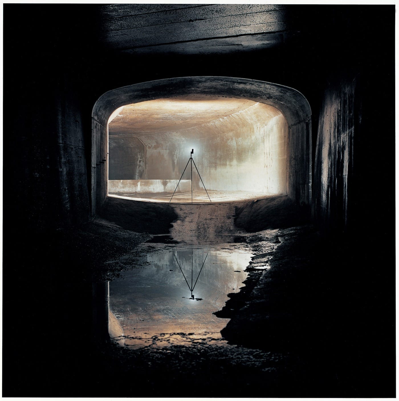 In Hatakeyama’s photographs of the city, there’s a cramped feeling of loneliness. Often, there are no human figures to be seen. Instead, street signs, empty stairwells, painted pavement, and towering high bridges take the focus. Sometimes, Hatakeyama offers just a glimpse of his own place in the scene when the shadow of his camera appears. One particularly eerie series, Underground (1999), features a lone tripod in a desolate culvert underneath the Shubuya river. Beneath the hum of the city, the damp scene represents an isolation that prevails throughout Hatakeyama’s depiction of urban landscapes. This palpable detachment is born out of his practice of viewing the world from a distance — framed and separate from the self.