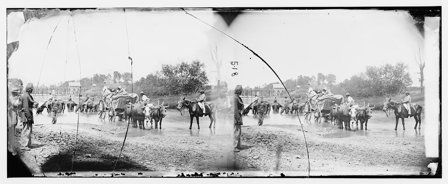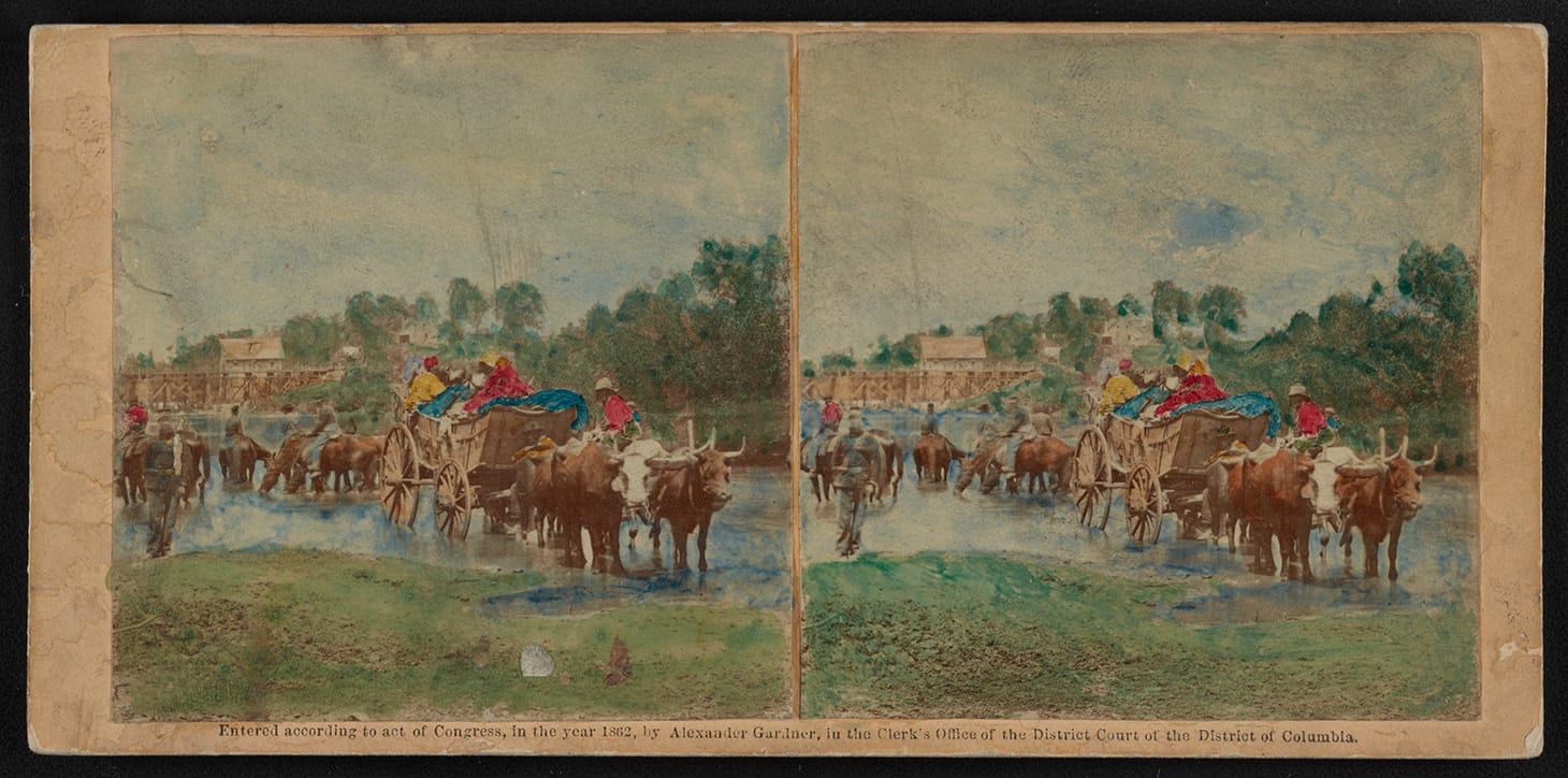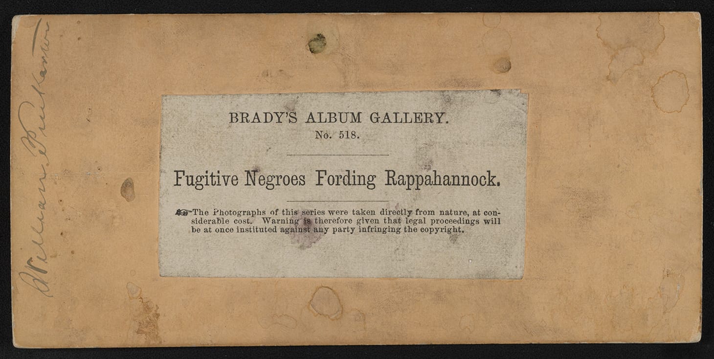 LR: Yes. So this is by one of the key famous Civil War photographers. He makes this image in 1862 by the Rappahannock River, Virginia. It’s titled “Fugitive Negroes Fording the Rappahannock.”