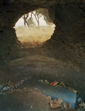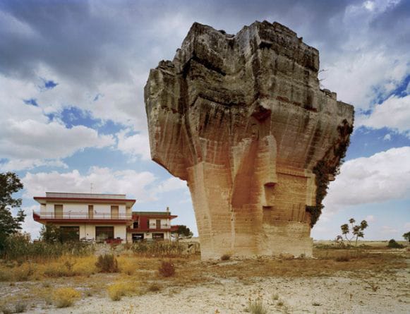 In his latest series of photographs, recently published by the Center for American Places, Wolke turned his lens on the landscape of southern Italy. Entitled Architecture of Resignation: Photographs from the Mezzogiorno, the series consists of large-format images of places filled with the architectural detritus of millennia — marble columns that are the lone survivors of an ancient city, an abandoned World War II military base, the interior of a Roman grave littered with modern garbage, the remnant of a quarried hill, sculpted by industry until all that’s left is an unearthly, oddly beautiful lump rearing up from a flat landscape. Whether in the city or the countryside, Wolke chose to photograph these spaces completely devoid of people. All we see are buildings and objects, decay and abandonment. Despite the gorgeous colors and the mastery of the printing process, they make the viewer somehow alienated from the traditional view of Italy as a living art gallery.