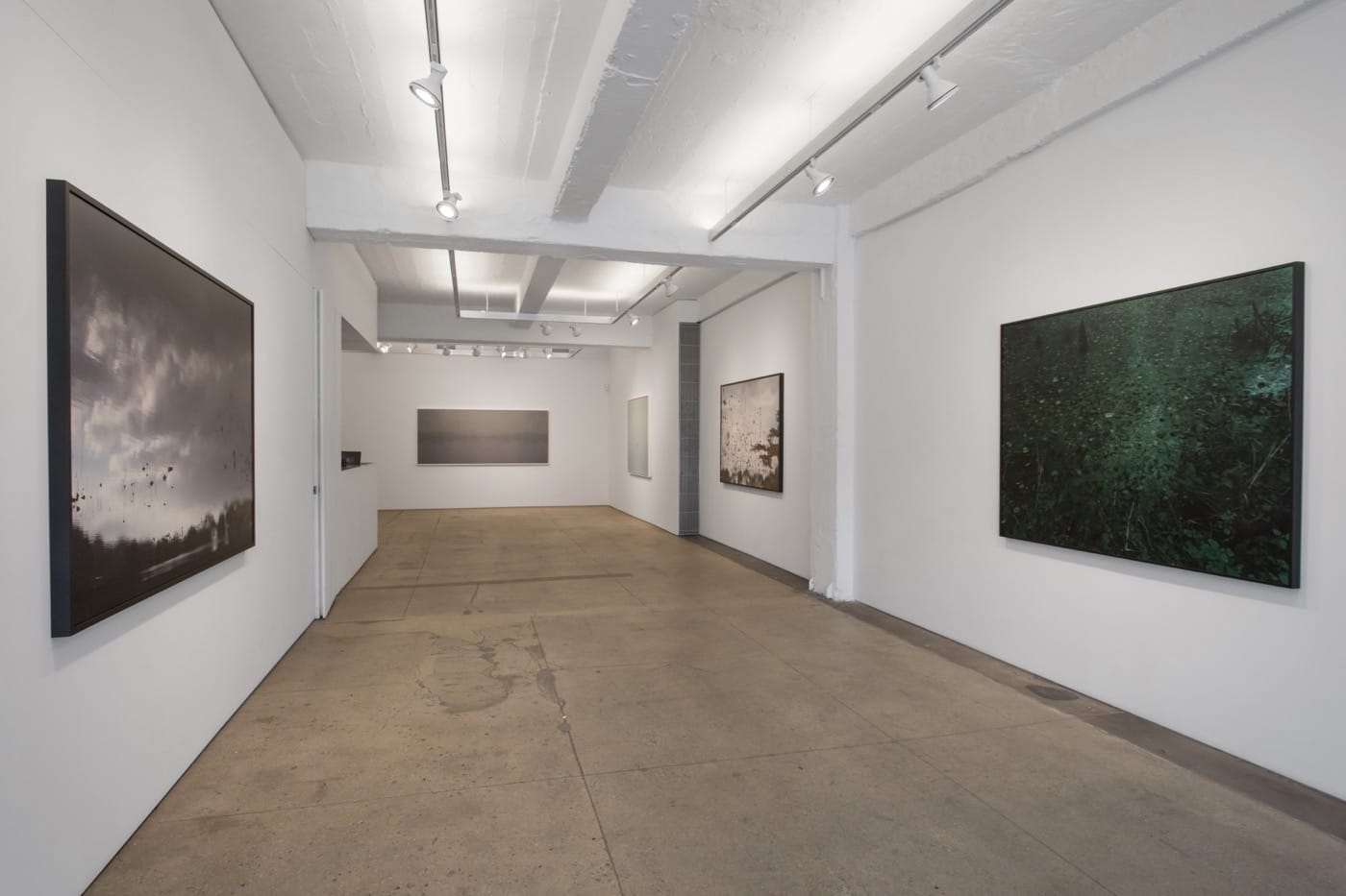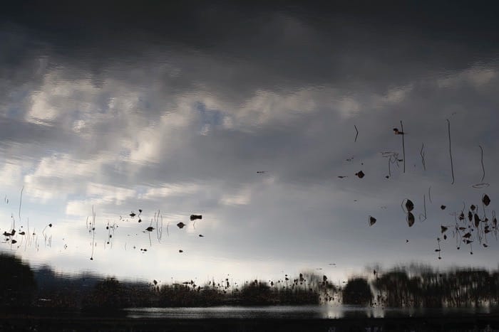 Looking at “Hanging Sky 05” (2016), I see reflections of the sky in a lake, along with a trail of trees along the far shoreline combined with the small heads of plants sticking out the water’s surface. I know it’s water I’m looking at because of the lines of striation created on its surface throughout the image, but the sky and lake are melded so seamlessly the rational part of me can’t parse what is truly up and what is down, what is here and what is there, what is ocean and what is firmament. I find out from reading about Gersht’s work and this show, which represents three distinct bodies of work — Hide and Seek-If Not Now When from 2008, Chasing Good Fortune from 2010, and Floating World from 2016 — that he fiddles with the original image in his postproduction process. Aspects of the image are fused and inverted, reflections made into a world you can visually swim in. This is how to fall in love.