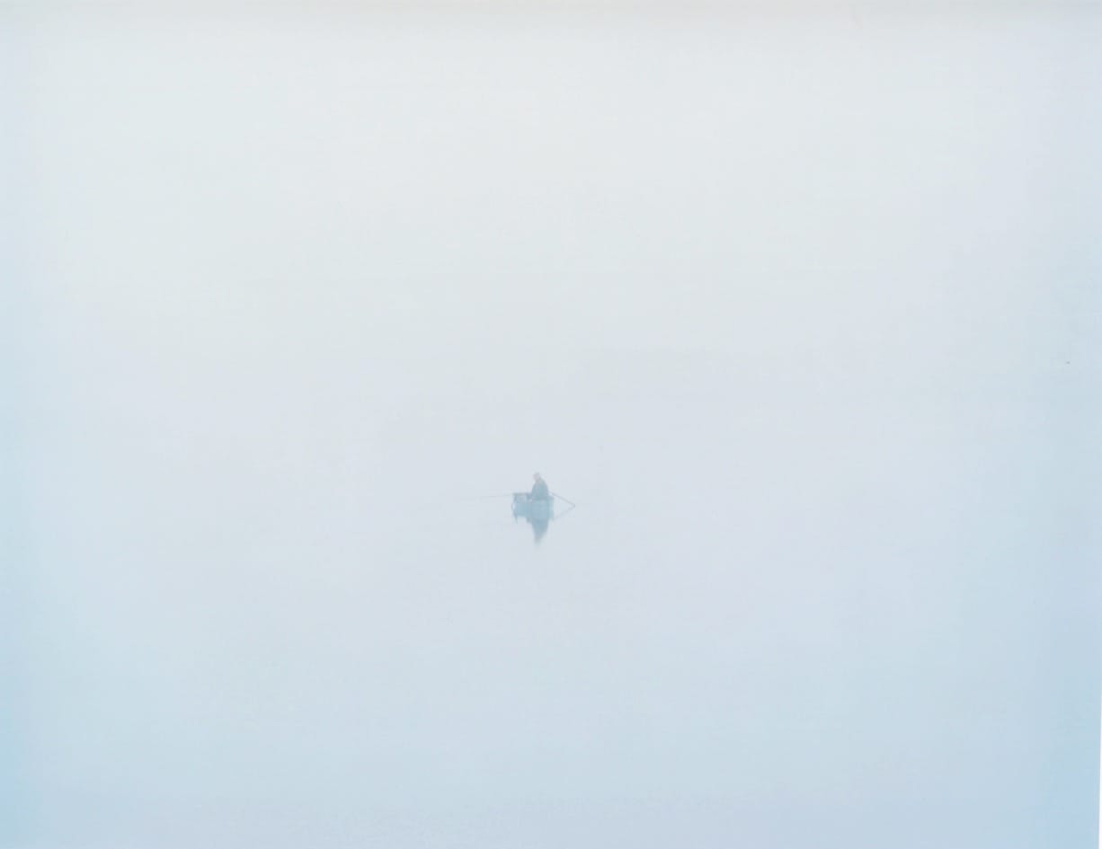 Having been a photographer myself, I appreciate him flouting other rules, such as the rule of thirds, for example in his piece “Hide and Seek: If Not Now When #01” (2008), where the horizon line is right smack in the middle of the composition, more or less evenly dividing the viewer’s attention between the water and the atmosphere above it. Despite Gersht not making a more determined choice about where to make the viewer look, the image is compelling. It is ethereal and eldritch and paired with the photograph to its right — “Hide and Seek: If Not Now When 03” (2008/17) — of a lone figure in a boat surrounded by the sea, the entire exhibition suggests that I don’t ever have to land. Gersht’s landscapes mean to cradle me in that oceanic, amniotic fluid where land, sky and sea never quite meet and are never really apart.