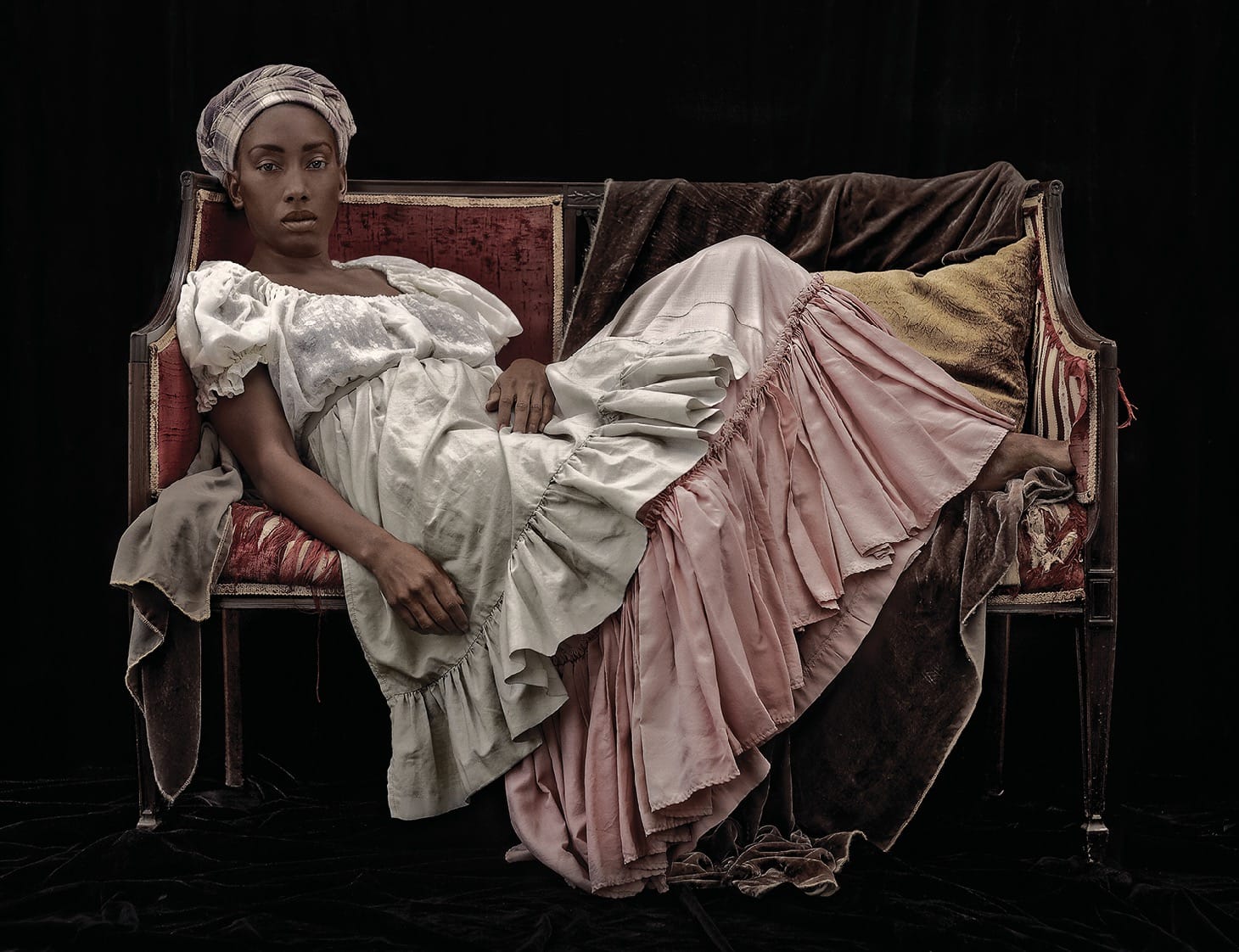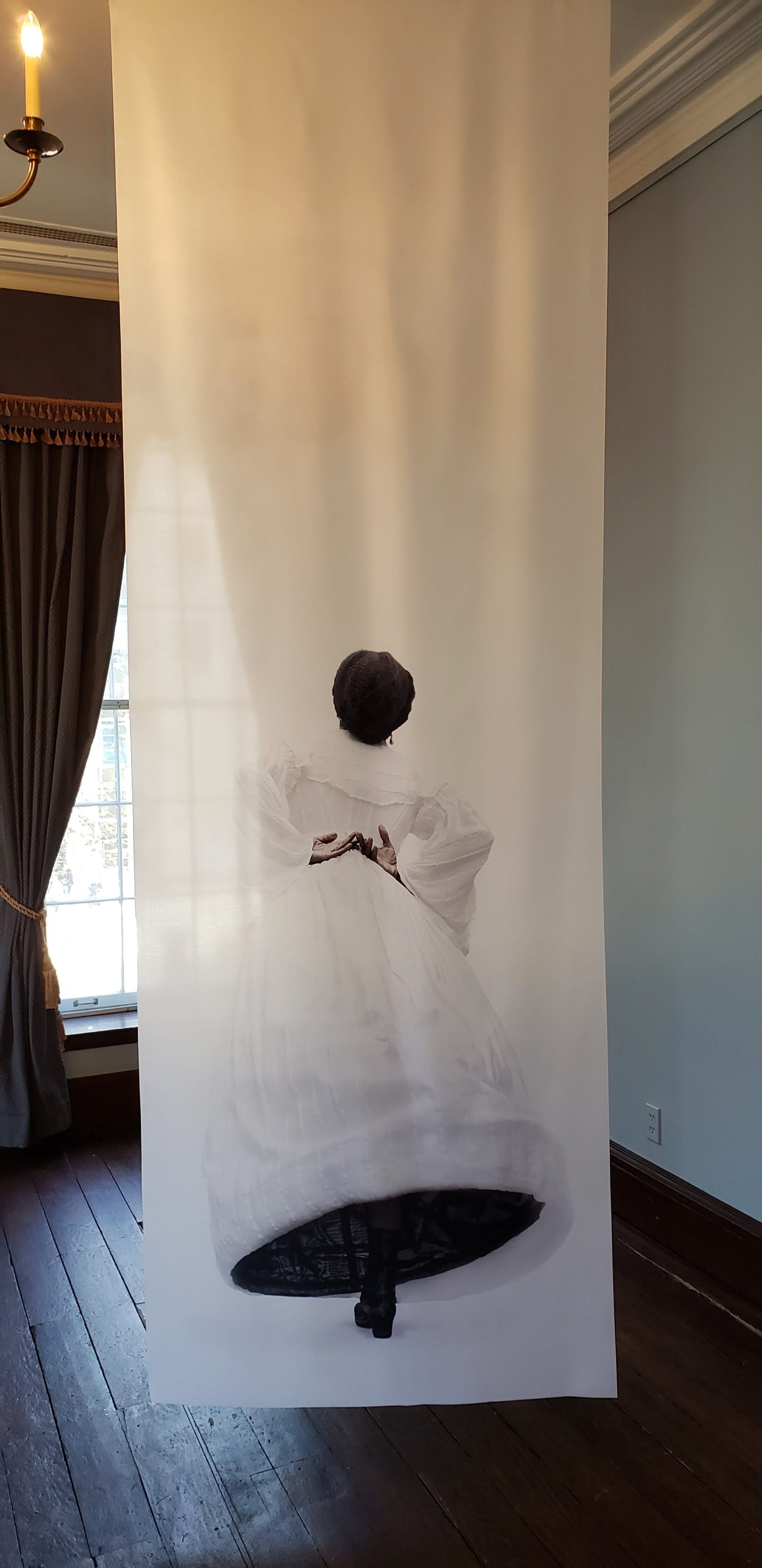 The artist Ayana V. Jackson uses her own body to repudiate the typical colonialist story by inserting herself in that story as a Black woman whose very presence prompts the viewer to consider those bodies made less visible by 19th-century middle-class portraiture. This is not at all a unique strategy (Elizabeth Colomba, Kehinde Wiley, John Akomfrah, and Yinka Shonibare come to mind immediately) but her work has incisive resonance being placed in the Campbell House Museum, which was built for a chief justice in 1851. In the images displayed in the downstairs sitting rooms, Jackson is outfitted in period dress and lays herself out in postures of repose, her impassive face staring at the viewer steadily accepting the viewer’s gaze as her rightful due. In the upstairs room, her figure is made ephemeral, printed on starkly white fabric, her body floats in space, but is still an indomitable presence, steadily observing or going about her own business.