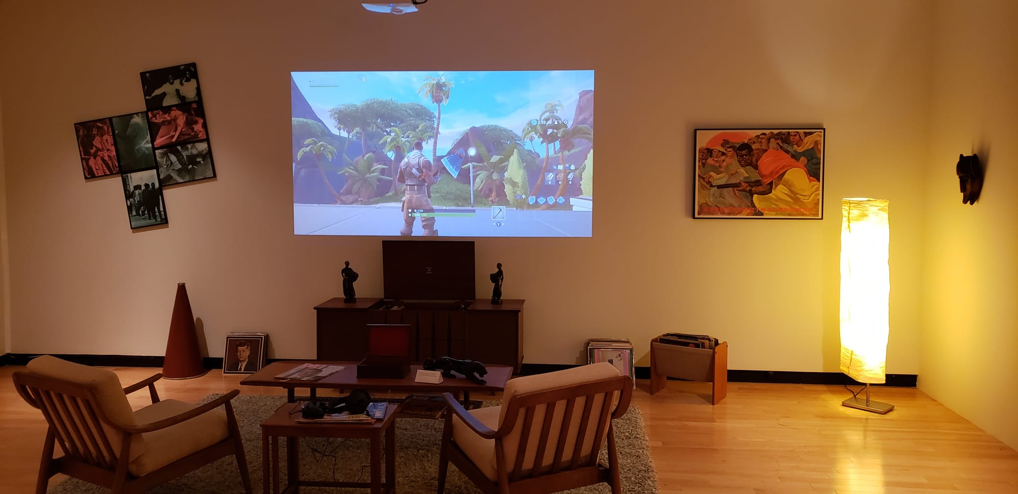 On the other hand, Weems’s Heave installation at the University of Toronto, constructed around a body in absentia, by providing all the indicia of this body’s lived life, impels the viewer to read this life as affirmatively Black. The installation consists of an entire living space with furniture, lamps, wall art, carpeting, a video monitor, and many, many tchotchkes. I love that when I walk over to pile of vinyl records in jackets propped against the wall, and look at the one on top, the record indicated is mounted inside the nearby credenza on its partially hidden turntable. The whole installation evokes a sense of Blackness as a cultural place and space to occupy and also to build. Though Weems has several other pieces on display, particularly at the CONTACT gallery, these works are the most visually arresting.