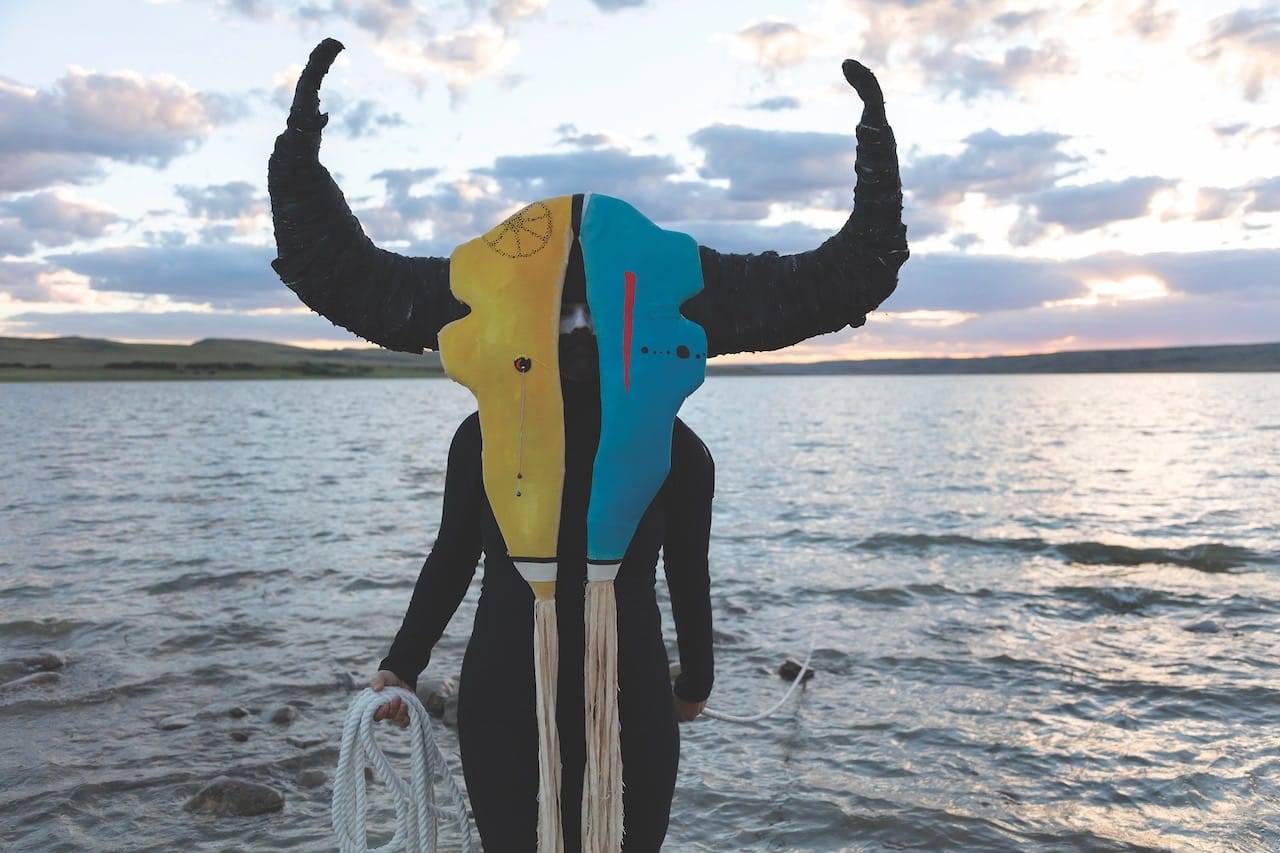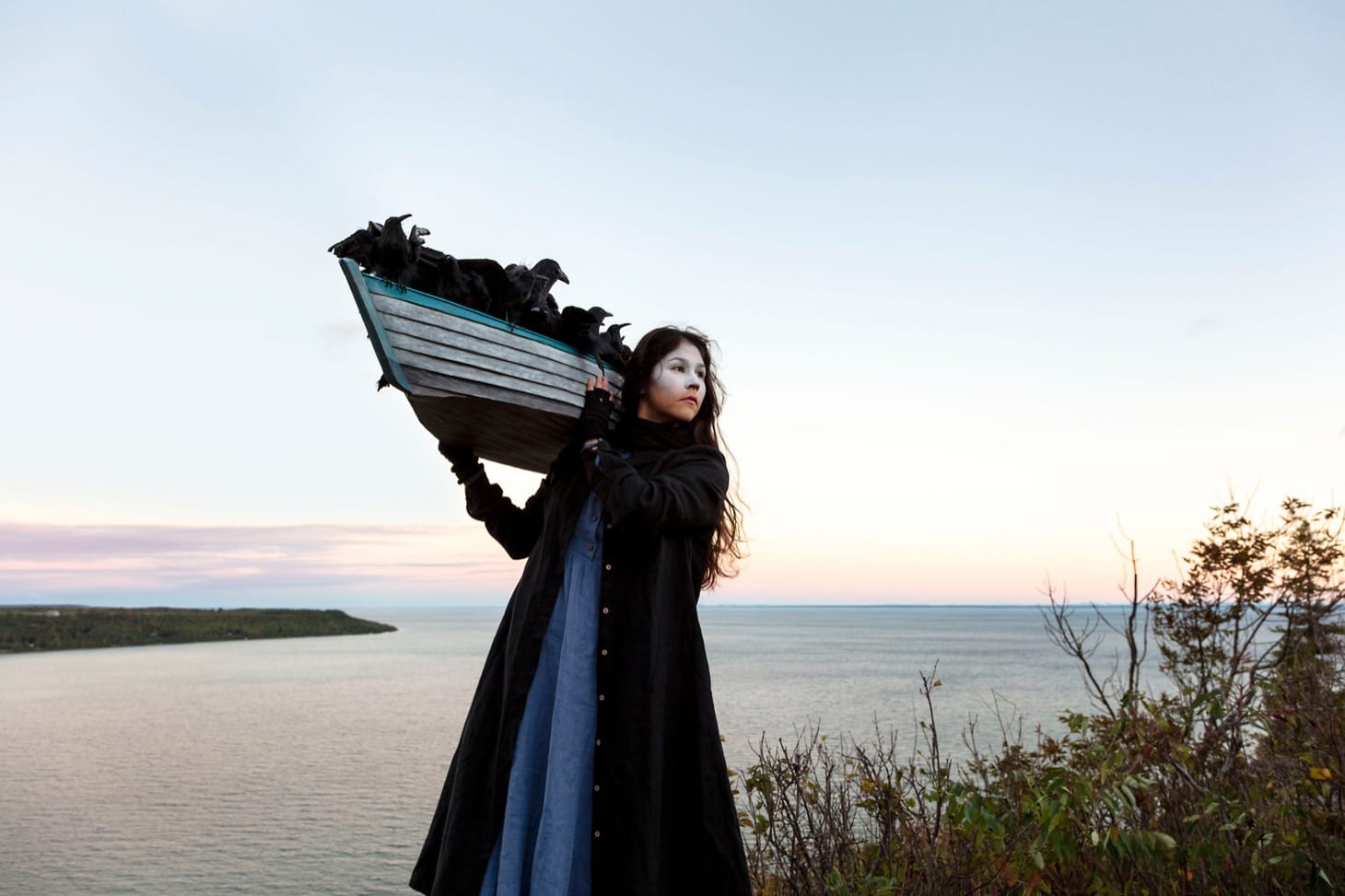 My favorite exhibition was where the body operates as a stand-in for a lost tribe or clan: Meryl McMaster‘s As Immense as the Sky. In the photos displayed at the Ryerson Image Center, McMaster makes herself into an inscrutable but fantastic set of avatars. In one image, “Deep Into the Darkness Waiting” (nd), she appears as someone who is carrying the gift of fire on her back while light blue birds perch on her long curving hat of woven wood. In “On the Edge of This Immensity” she carries on her shoulder a small canoe filled to overflowing with blackbirds, crows, or ravens. In these images, she is often half or fully masked with white facepaint, which makes her appearance even more fey. McMaster claims both “Western and indigenous” according to the CONTACT catalogue. Her photographs, hung at both the Ryerson and Stephen Bulger gallery, utilizes this mixed heritage to play with the idea of the shaman figure, the one who might be able to see another reality underlying our own, and even perhaps enter it and bring back tokens of the journey.