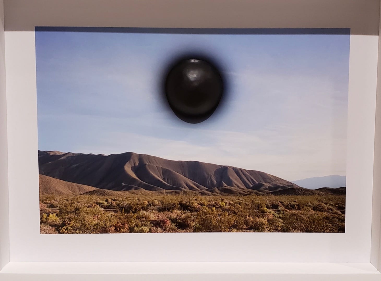 Lastly, Sarah Ann Johnson, though most of her images don’t contain bodies, showed fascinating manipulations of the medium by using three-dimensional objects inserted through the photograph to make the images take on the import of stage backdrop. in “Sun (Bump)” (2018) an onyx ball pushes through the photo of a landscape where the sun might be, except here, the sun is in eclipse and much closer than it should be. Most of Johnson’s work is set in the desert where obelisks and trees sprout as artistic interventions that make these landscapes forbidding and vaguely inhospitable.