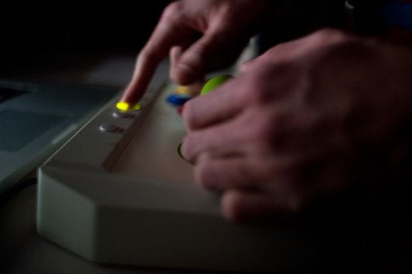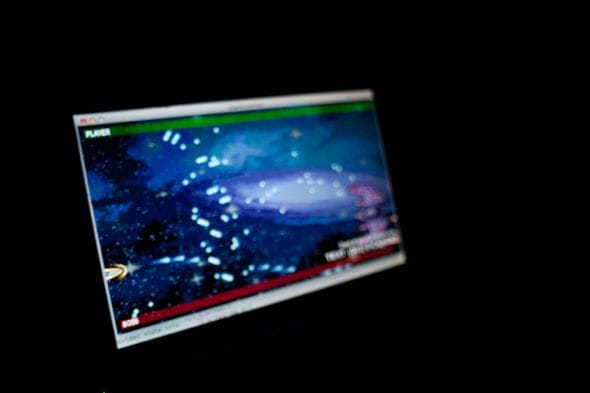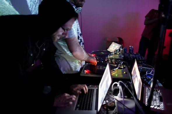 The creators of the the Aliens That Look Like Skrillex game project have an “interesting” hypothesis. They think that aliens are trying to communicate with us through dubstep, but we measly humans interpret their actions as hostile and go on the offensive. In the line with this theory, their DJ, who was set up on the stage, was controlling the spaceship in their game using turntables. The player had to detroy the DJ’s spaceship using lasers.