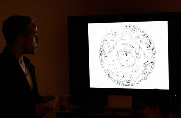 As a stipulation for all Hyperallergic HQ events, I asked Powhida to start his lecture with a 5 – 10 minute video to set the mood. He chose Kenneth Anger’s “Lucifer Rising, Pt. 1” (19??).