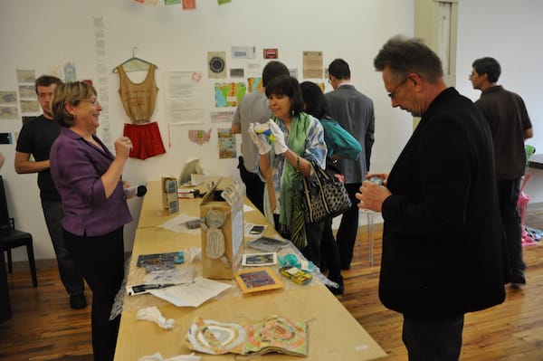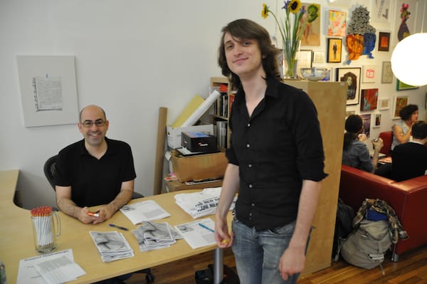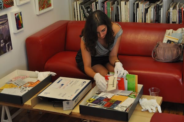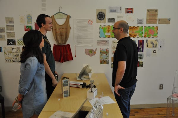 Hyperallergic publisher, Veken Gueyikian, giving a little tour of the mail art works to L Magazine‘s Benjamin Sutton and local Williamsburger Vana Khanjian.