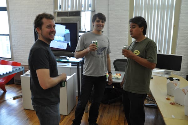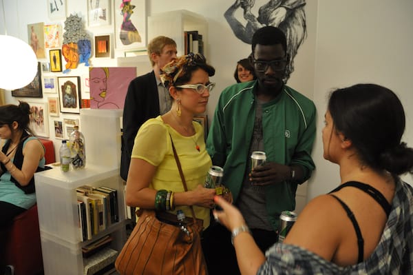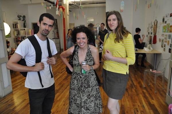 Bloggers and arts writers congregate early on during the party, including (left to right) Ben of C-monster, Carolina Miranda (the C-monster herself), and Rhizome’s senior editor, Joanne McNeil.