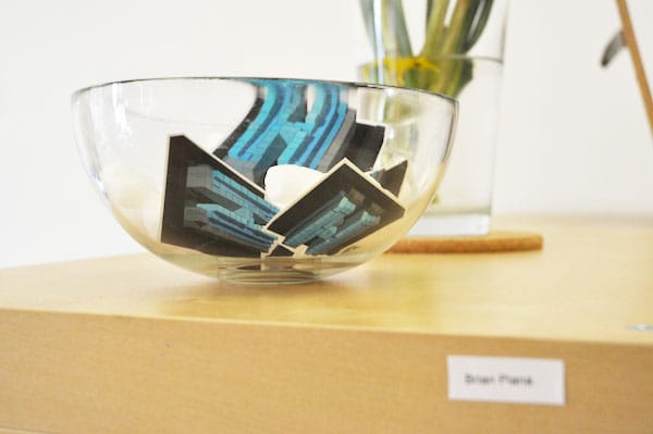 A view of Brian Piana’s digitized Hyperallergic Hs, which we displayed in a bowl during the show.