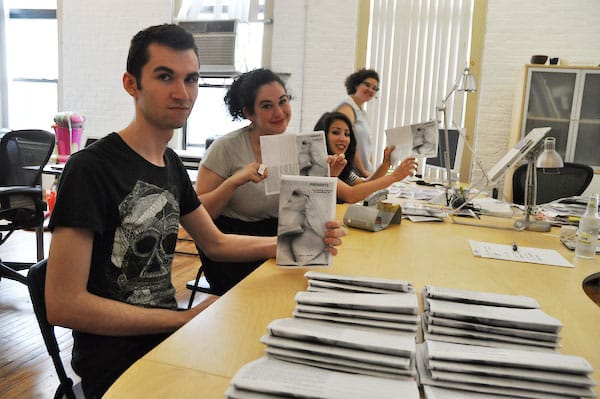 As we prepared for the opening later that night, a group of Hyperallergic summer interns, Alexander Cavaluzzo, Jocelyn Silver and Ayanno Elsom, help co-curator Kate Wadkins put the limited edition Presents zine catalogue together.