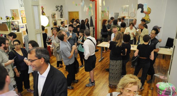Another view of the party goers with some artists in the mix, including Don Voisine and Bernard Klevickas (center), William Powhida (back left) and Nate Hill (back center).