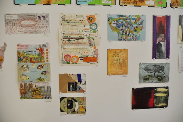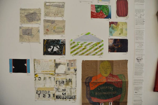 A view of many of the collage-based works on the central mail art wall, including (clockwise from bottom left) works by Jennifer Pei Huang, Kate Rhoades, Austin Thomas, Brian Wolf, KURV, Mary Rork-Watson and Timm Mettler.