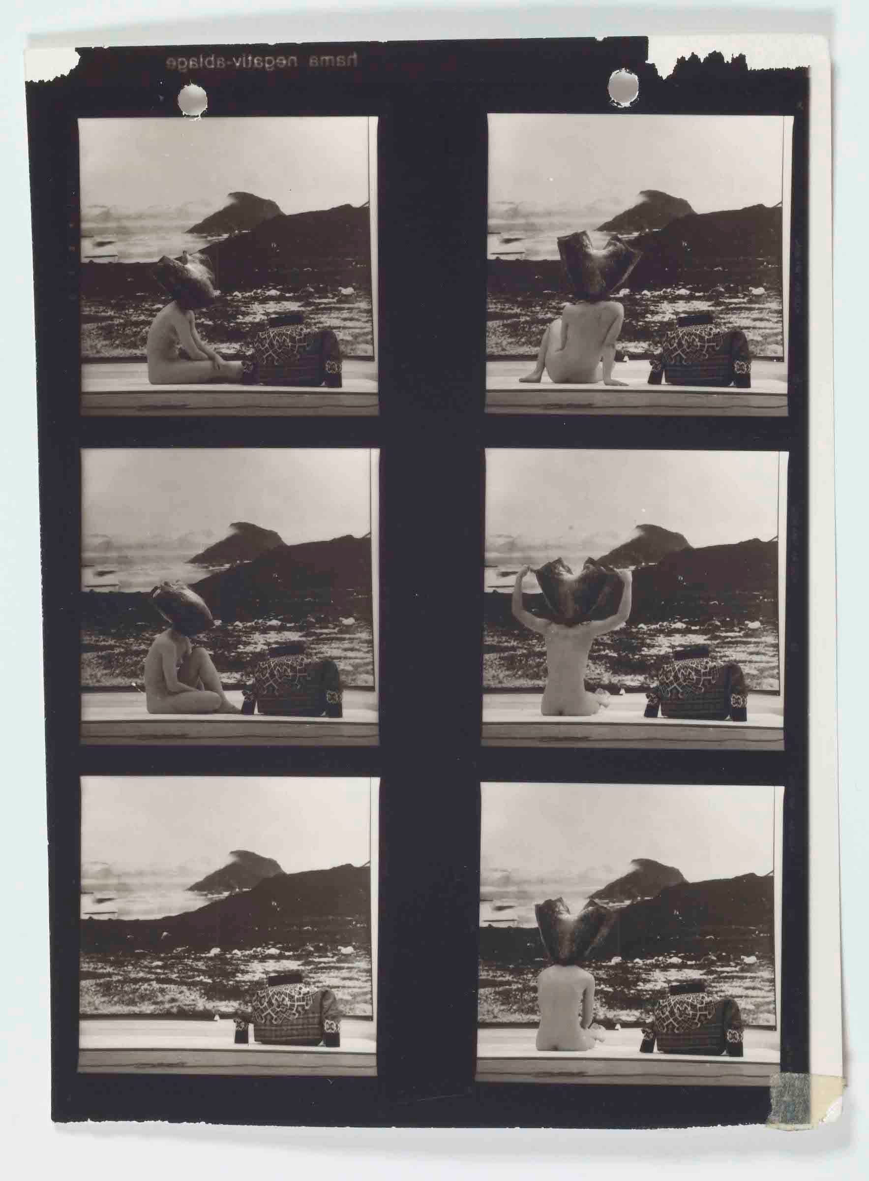 Arke’s project of archiving her Inuk lineage later in her career was cut short by her death from cancer at age 48. Some of the show’s final galleries are devoted to numerous photographs and stories that she collected while revisiting the area where she was born and other Greenlandic Inuit regions. She published these in her book Stories from Scoresbysund (2003), some of whose pages are exhibited as a single sprawl. Her impressive quest to create an archive harks back to her earliest photographic series. For Imaginary Homelands alias Ultima Thule alias Dundas ‘The Old Thule’ (1992/2003), she captures Greenlandic home construction with a pinhole camera. She also made works with a camera obscura that she built so she could fit inside of it as if inside a house (a replica is on view). In “Self-Portrait” (1992), for example, she poses naked against Greenlandic landscapes. These late and early works, which together compose an archive that’s both intimate and communal, trace Arke’s desire not simply to call forth memories but rather to reinscribe them with the reality of the body against its representation by White colonizers. While questioning the historical tools of archiving, she also re-anchored it in actual physical bodies — starting with her own.