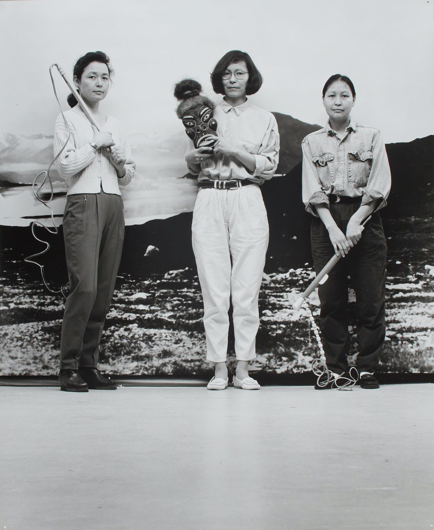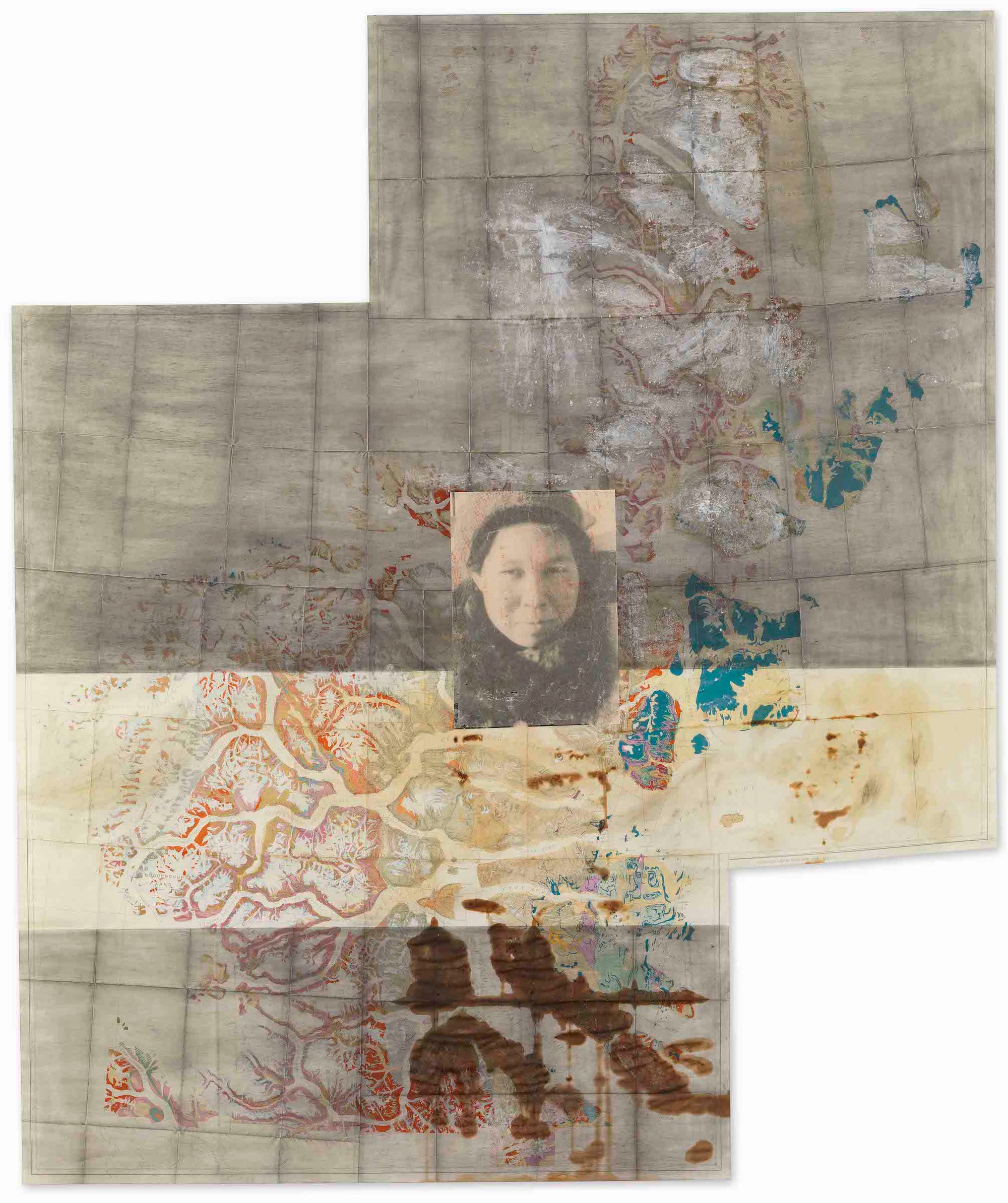 Arke’s works pierce this fantasy. For instance, her collages of old photographs in the series Arctic Hysteria IV (1997) alternate photos of unidentified and unclothed Greenlandic women with those of named and fully clothed White explorers. A work in another collage series, Legend I–V (1999), for which Arke layered photographic portraits over Western researchers’ maps of Greenland, incorporates an old picture of Arke’s Inuit mother (her father was Danish) and another young woman smiling alongside a White man. It’s this kind of propaganda that, as artist Tiara Roxanne notes in her catalog essay, the Danish government used to justify the forced urbanization of Inuit people — as well as the destruction of their livelihoods and traditions — as modernization.