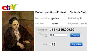 The Bygone Bureau's Jimmy Chen imagines what it would be like if Picasso had used eBay [http://bygonebureau.com/2010/12/15/picassos-ebay-period/]. Hilarity ensues. Great line, "bitch i’m trying to make a living. check out my new painting."