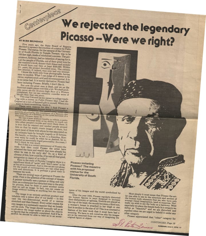 While it seems like few Floridians truly appreciated the Picasso in the ’70s, Oles found a clue that suggests how some were a little bothered by the missed opportunity for Tampa. A June 1984 op-ed for the local paper carries the searching headline, “We rejected the legendary Picasso — Were we right?” Its author, a modern painting professor at Eckerd College, didn’t dwell on critiquing the sculpture (“Briefly, I don’t like it.”). But then he launched into a nearly five-page wrangling of Picasso’s life and oeuvre before ending on a gracious thought.