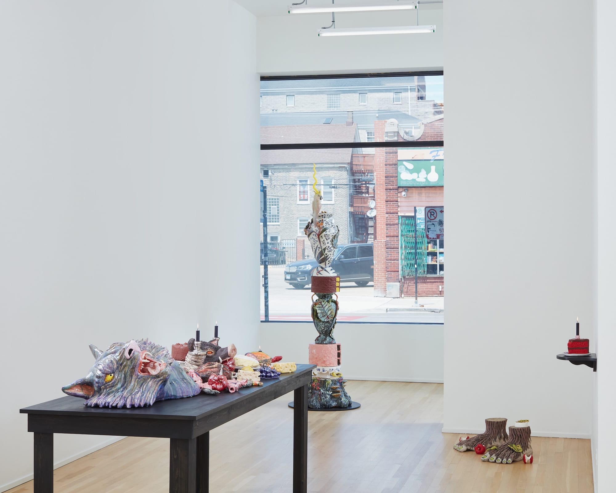 Bulldozing through Roxanne Jackson's solo exhibition Candleholders for the Underworld, the truck demolished one of her sculptures, valued at over $22,000 according to Rafacz, and pelted the rest with shattered glass. The metal spindle foundation of the demolished "Sweet Leaf Twilight" (2023) tower was driven through the stained oak floors of the gallery and is still stuck there, jutting out of the wood by a foot and a half. In the field for over 20 years, Rafacz said that calling Jackson about the destruction of her work was "truly at the bottom of the list of phone calls he ever wanted to make."